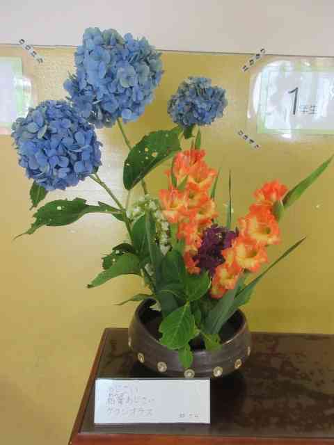 今週のお花は、 あじさい、柏葉あじさい、グラジオラスです。 すっと背の高いあじさいがひときわ目をひきます。