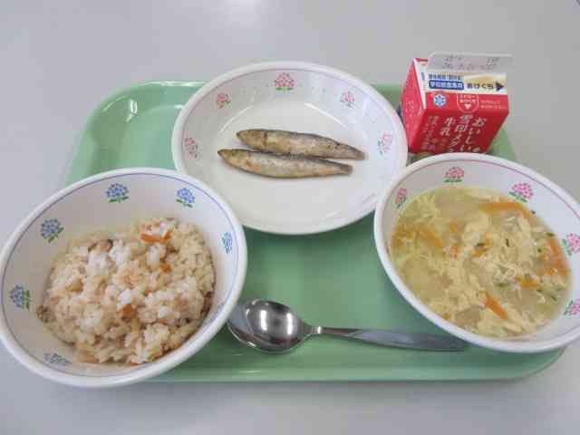 今日の献立は、中華風炊き込みご飯、スプラットの唐揚げ、とうもろこしスープ、牛乳です。 みなさんは食事の前にお腹がすいていますか。水分をとりすぎてしまったり、運動不足だったりするとお腹がすかないので、食事を残しがちになります。お腹がすいていると、苦手なものもおいしく食べられることがよくあります。みなさんはよりよく成長するために、食事をしっかり食べることが大切です。 お米は、熱や力のもとになるきいろのなかまの食べ物です。【添付ファイル】