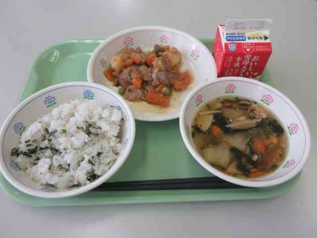今日の献立は、わかめごはん、肉じゃが、吉野汁、牛乳です。 今日は食育の日です。豚肉と冬瓜は神奈川県内産です。 肉じゃがは、ビーフシチューがもとになってできた料理といわれています。外国で食べたビーフシチューがおいしかったので、作ってほしいと日本人が帰ってきて料理人にお願いして作ってもらったのが肉じゃがの始まりだといわれています。 じゃがいもは、熱や力のもとになるきいろのなかまの食べ物です。