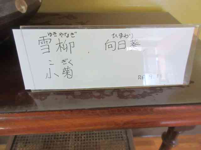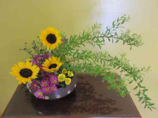 9月11日のお花は、 雪柳、向日葵、小菊です。 まだまだ暑い日が続いています。 暦の上ではもう秋です。 ひまわりと小菊のハーモニーが可愛らしいですね。