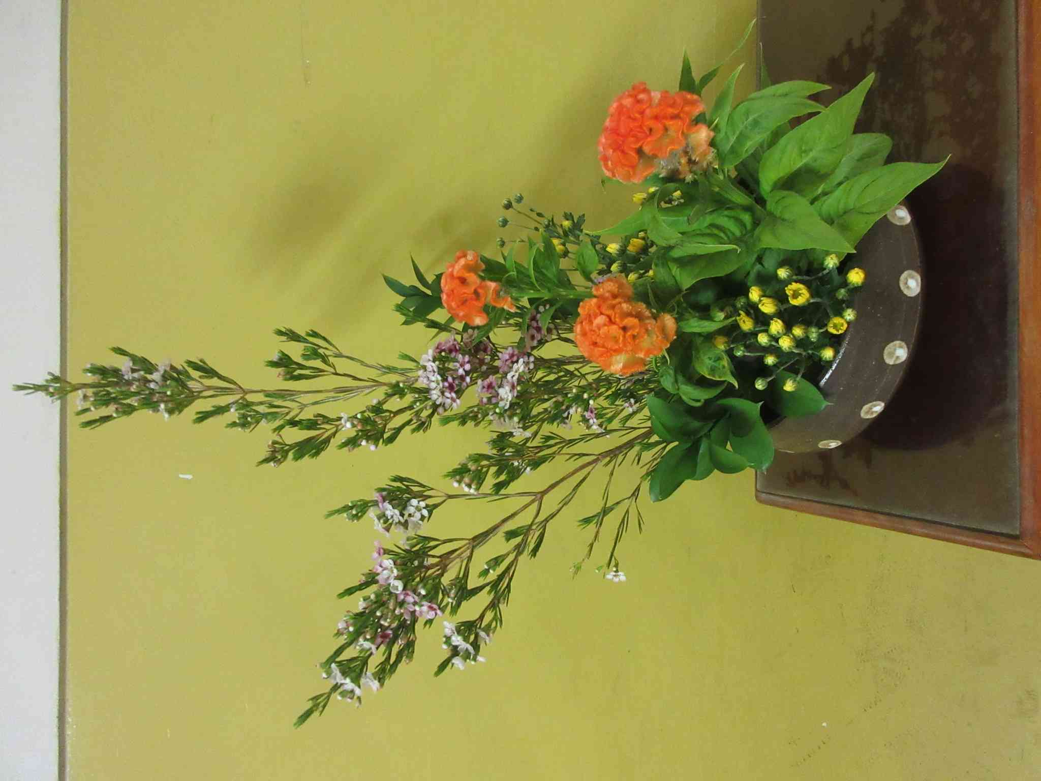 式典前日の9月20日。 「会場は北小ではないけれど」と安藤さんがお花を生けてくださいました。 親子で50年も続けてくださっている生け花のボランティアです。 9月20日のお花は、 ワックスフラワー、ルスカス、ケイトウ、小菊です。 ワックスフラワーは、現在、春のオーストラリアから空輸されました。