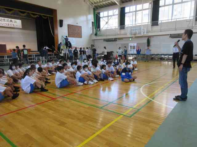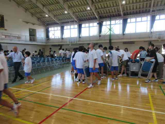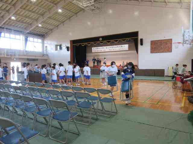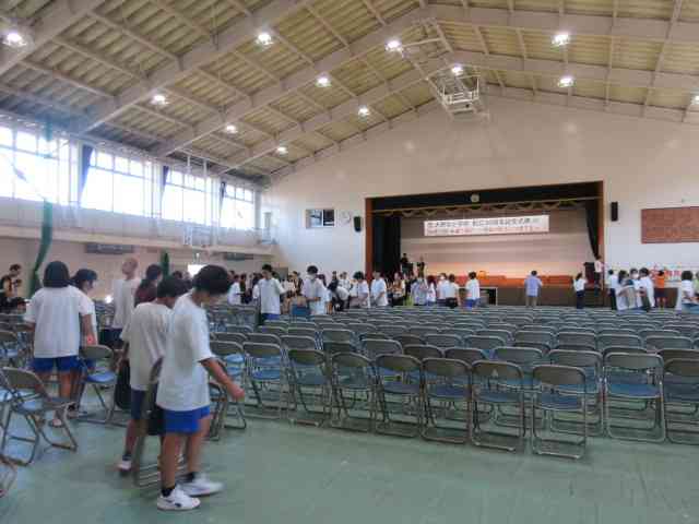 大野北中学校の体育館をお借りしての式典実施のために、 実行委員さんや教職員が総出で、楽器やひな壇などを運びました。 そこへ、事前登録でお手伝いを申し込んでくれた中学生が、 緑のシートを敷いたり、イスを並べたりしてくれました。 とても手際よく作業を進めてくれました。 中学生の皆さん、ありがとうございました。