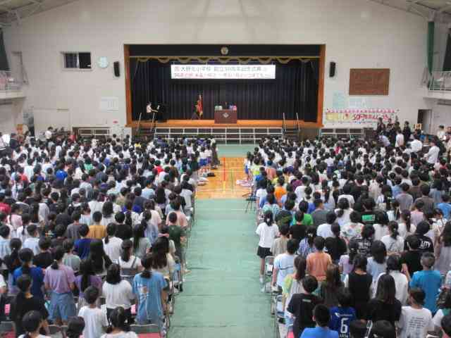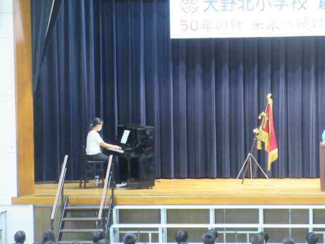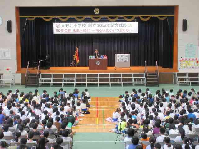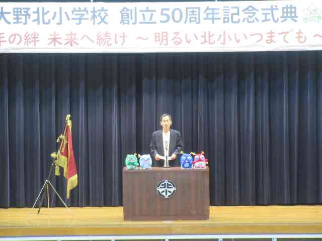 大野北小学校50周年おめでとう! 記念式典の始まりです。 第二部は、校歌をみんなで歌い、 実行委員長さんや校長のあいさつ、 実行委員さんからこれまでの事業が説明されました。 中でも、ぽんカブズのイラストのついた記念品の紹介で、 子どもたちは、大盛りあがりでした。 マスコットキャラクターのポンカブズが大人気なのが分かる場面でした。