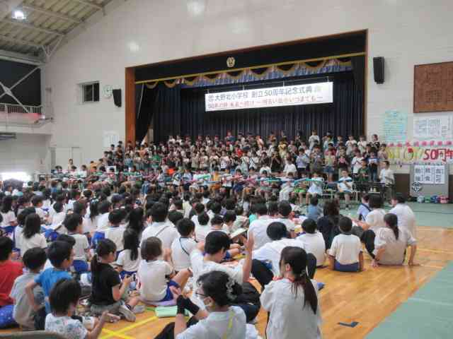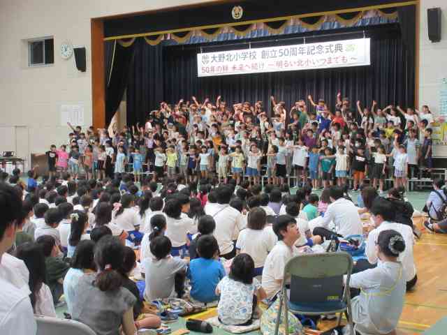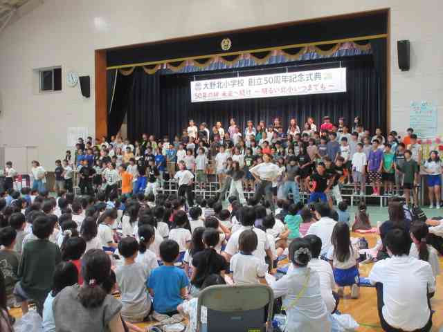 式典第二部後半は、高学年の学習発表でした。 4年生は、いきものがかりの「ありがとう」を「おめでとう」に替え、心を込めて歌い上げ、 5年生は、合奏でディズニーメドレーを軽快に演奏し、 6年生は、「THIS IS ME.」を力強く歌い、そして、踊り、 自分自身を表現しました。 北小に戻ると校章旗がはためいていました。