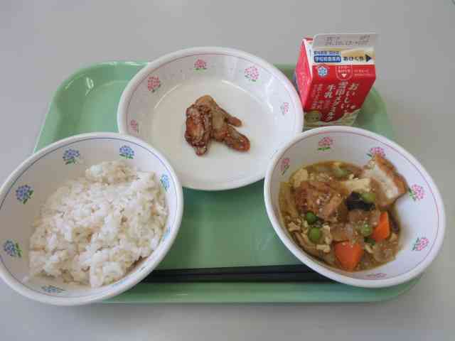 今日の献立は、玄米ごはん、生揚げのカレー煮、ごぼうの甘辛あえ、牛乳です。 ごぼうは、もともと中国から漢方薬として日本に伝わりました。ごぼうの種の部分を漢方薬として使われてきましたが、根っこの部分を野菜として食べられるようになったそうです。ごぼうには、おなかの掃除をしてくれる食物繊維がたくさん含まれています。よくかんで食べてください。 ごぼうは、体の調子を整えるみどりのなかまの食べ物です。
