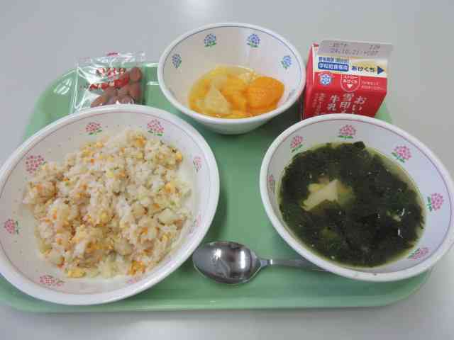 今日の献立は、五目チャーハン、わかめスープ、フルーツあえ、アーモンド、牛乳です。 卵は相模原市内産です。 五目チャーハンの五目とは、いろいろな具が混ざっているという意味です。今日の五目チャーハンには、炒り卵、ハム、にんじん、長ねぎ、しょうが、かまぼこが入っています。味付けは塩こしょう、しょうゆ、酒にオイスターソースも使いました。 お米は、熱や力のもとになるきいろのなかまの食べ物です。
