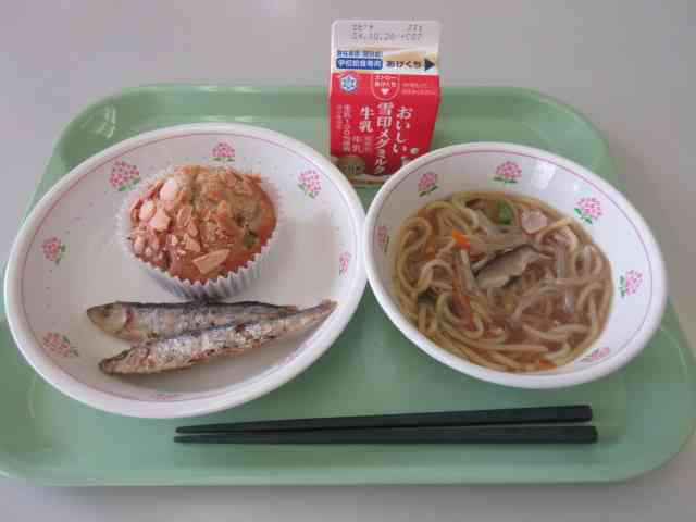 今日の献立は、サンマーメン、スプラットの唐揚げ、アーモンドバナナケーキ、牛乳です。 アーモンドバナナケーキは給食室の手作りです。ホットケーキ用小麦粉に豆乳とバター、バナナ、砂糖、アーモンドを入れて作りました。バナナは、フィリピンやメキシコなど気温の高いところでたくさん作られています。バナナは炭水化物、カリウム、ビタミン、食物繊維がたくさん含まれています。 バナナは、体の調子を整えるみどりのなかまの食べ物です。【添付ファイル】