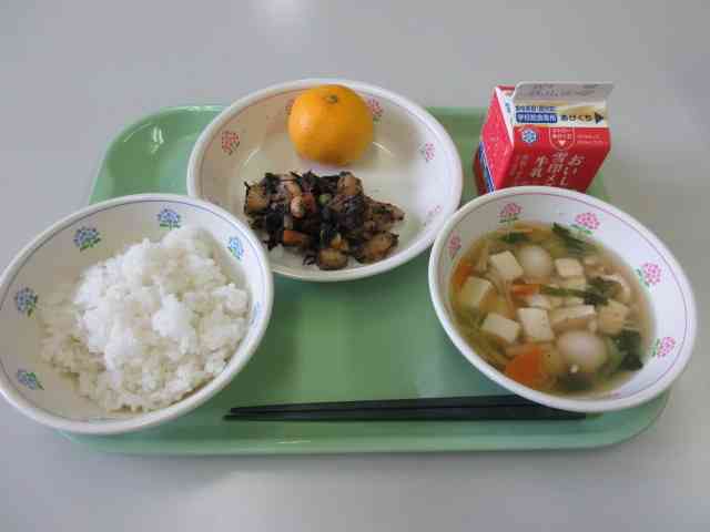 今日の献立は、ごはん、磯辺煮、すまし汁、みかん、牛乳です。豚肉は神奈川県内産です。 磯辺煮の磯辺とは、のりなどの海藻を使った料理につけられる名前です。磯辺揚げ、磯辺焼き、磯辺あえ、磯辺もちなどがありますね。今日の磯辺煮には海藻のひじきが入っています。ひじきには、骨や歯を丈夫にするカルシウムや、お腹の調子を整える食物繊維がたくさん含まれています。 ひじきは、体をつくるもとになる赤のなかまの食べ物です。