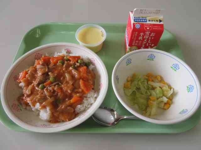 今日の献立は、ハヤシライス、キャベツとコーンのソテー、パンプキンプリン、牛乳です。 豚肉は神奈川県内産です。 ハロウィンは、秋の農作物の収穫をお祝いし、悪いお化けを追い払います。外国では子どもたちが仮装して、いろんな家をまわり、お菓子をもらって食べるという習慣があります。今日はハロウィンにちなんでかぼちゃでパンプキンプリンを給食室で作りました。 かぼちゃは、体の調子を整えるみどりのなかまの食べ物です。