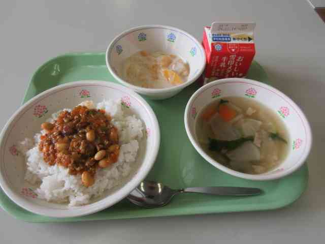 今日の献立は、ごはん、豆まめドライカレー、大根とベーコンのスープ、ヨーグルトポンチ、牛乳です。 いよいよ運動会ですね。赤組も白組もがんばってほしいので、大豆と金時豆の紅白2色のお豆が入ったドライカレーにしました。しっかり食べてスタミナをつけて体の調子を整えましょう。運動会で元気に活躍するためには、食事をきちんととること、夜早くねることが大切です。当日の朝ごはんも必ず食べてきてくださいね。 ヨーグルトは、体をつくるもとになる赤のなかまの食べ物です。【添付ファイル】