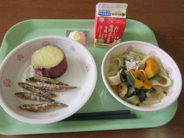 今日の献立は、ほうとう、きびなごの唐揚げ、焼き芋、型抜きチーズ、牛乳です。 ほうとうは、神奈川県のお隣、山梨県の郷土料理です。山梨県は昔米作りが難しく代わりに麦を作っていたので、麦で麺を作り野菜と一緒にみそで煮込んで食べたのがほうとうの始まりだそうです。野菜が少ない冬でも、夏から保存できるかぼちゃを入れて作っていたようです。 うどんは熱や力のもとになるきいろのなかまの食べ物です。