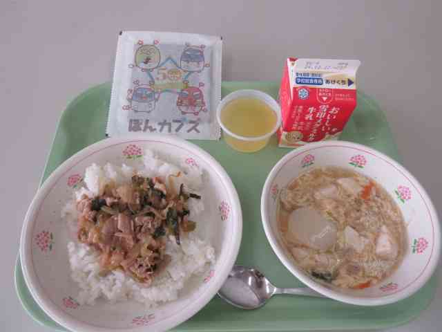 今日の給食は6年性が考えてくれた献立です。「のりまきまきまきにこにこ給食」で豚キムチ丼、手巻きのり、トック汁、ゆずみかんゼリー、牛乳です。 50周年をお祝いした北小オリジナル給食を考えてくれました。手巻きのりは、特別にぽんカブズのイラストが袋についています。ゆずは相模原市内産、みかんは学校のみかんの木からのぞみさんのお友だちが収穫してくれたものを使ってゼリーを作りました。 のりは体をつくるもとになる赤のなかまの食べ物です。【添付ファイル】