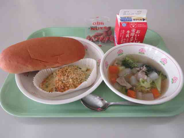 今日の献立は、黒パン、かれいのパン粉焼き、冬野菜スープ、アーモンド、牛乳です。 ぶたにくは神奈川県内産、里芋と大根は相模原市内産です。 里芋、大根、にんじんは、土の中で育つ冬野菜です。冬野菜は、寒い外や冷たい土の中でじっくり成長するため、栄養成分がぎゅっとつまっていて、甘みが強く、食べると体がポカポカします。 里芋は、熱や力のもとになるきいろのなかまの食べ物です。