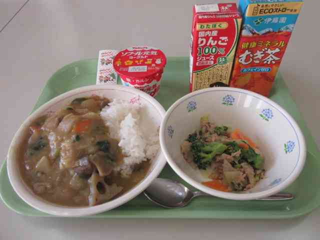 今日のお楽しみ給食の献立は、冬野菜のカレーライス、冬野菜のサラダ、ヨーグルト、飲み物セレクトです。キャベツは神奈川県内産です。 冬野菜のカレーライスには、鶏肉、里芋、ごぼう、れんこん、にんじん、しめじ、しょうが、ほうれん草が入っています。米粉でルウを作りました。 冬休みは楽しい行事がいっぱいですね。おうちの人のお手伝いをたくさんして、おせち料理など行事食を食べて元気にすごしてください。 ブロッコリーは、体の調子を整えるみどりのなかまの食べ物です。【添付ファイル】