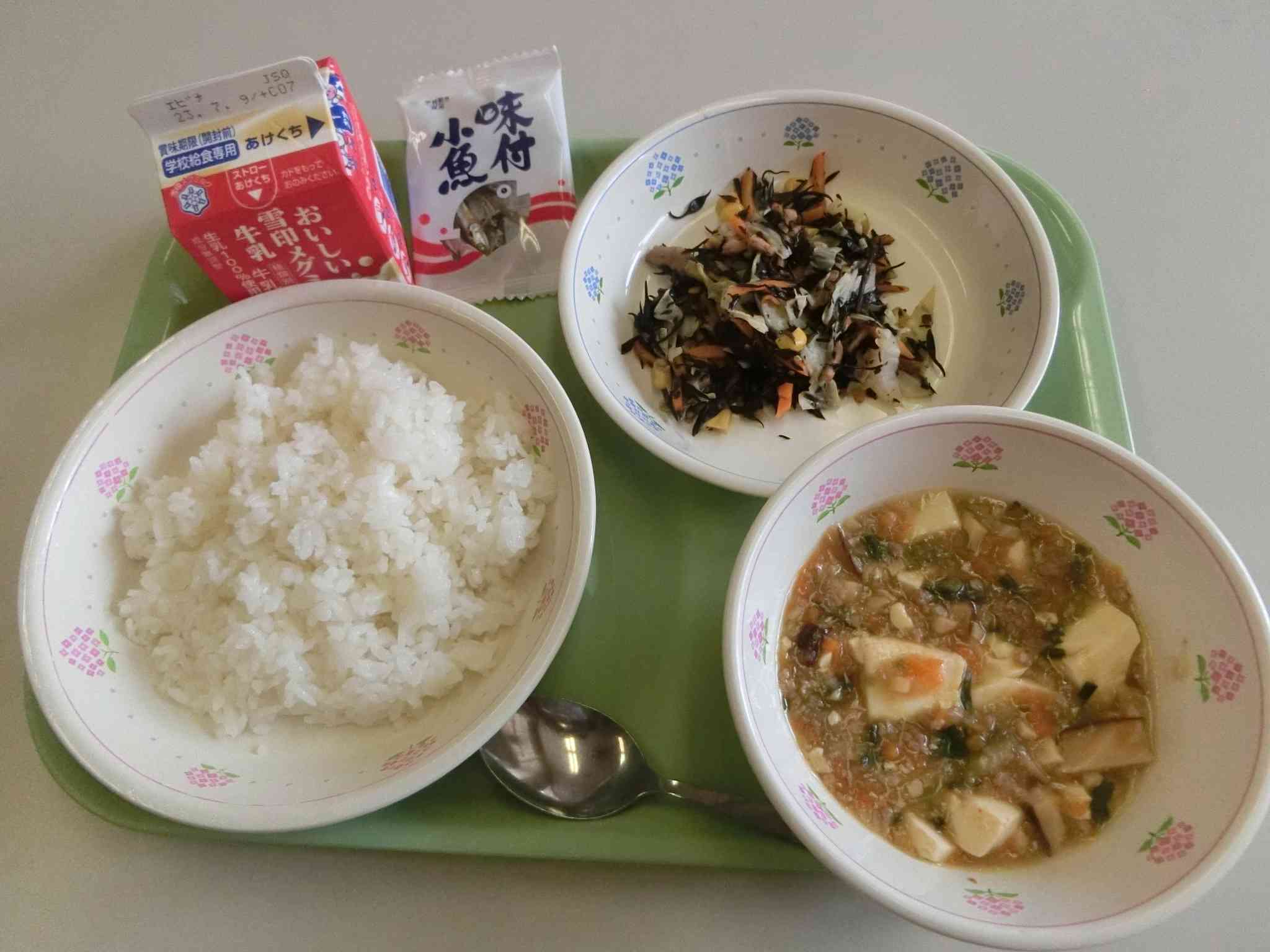 今日の献立は、ごはん、麻婆豆腐、ひじきの中華ソテー、味つけ煮干し、牛乳です。 キャベツは相模原市内産です。 ひじきは海でとれる海藻です。 ひじきには骨や歯をじょうぶにしてくれる カルシウムや鉄などの無機質がたくさん含まれています。 今日はひじきをハム、にんじん、とうもろこし、キャベツと いっしょに炒めてオイスターソースなどで味付けして 中華ソテーにしました。 ひじきは体をつくる赤のなかまの食べ物です。