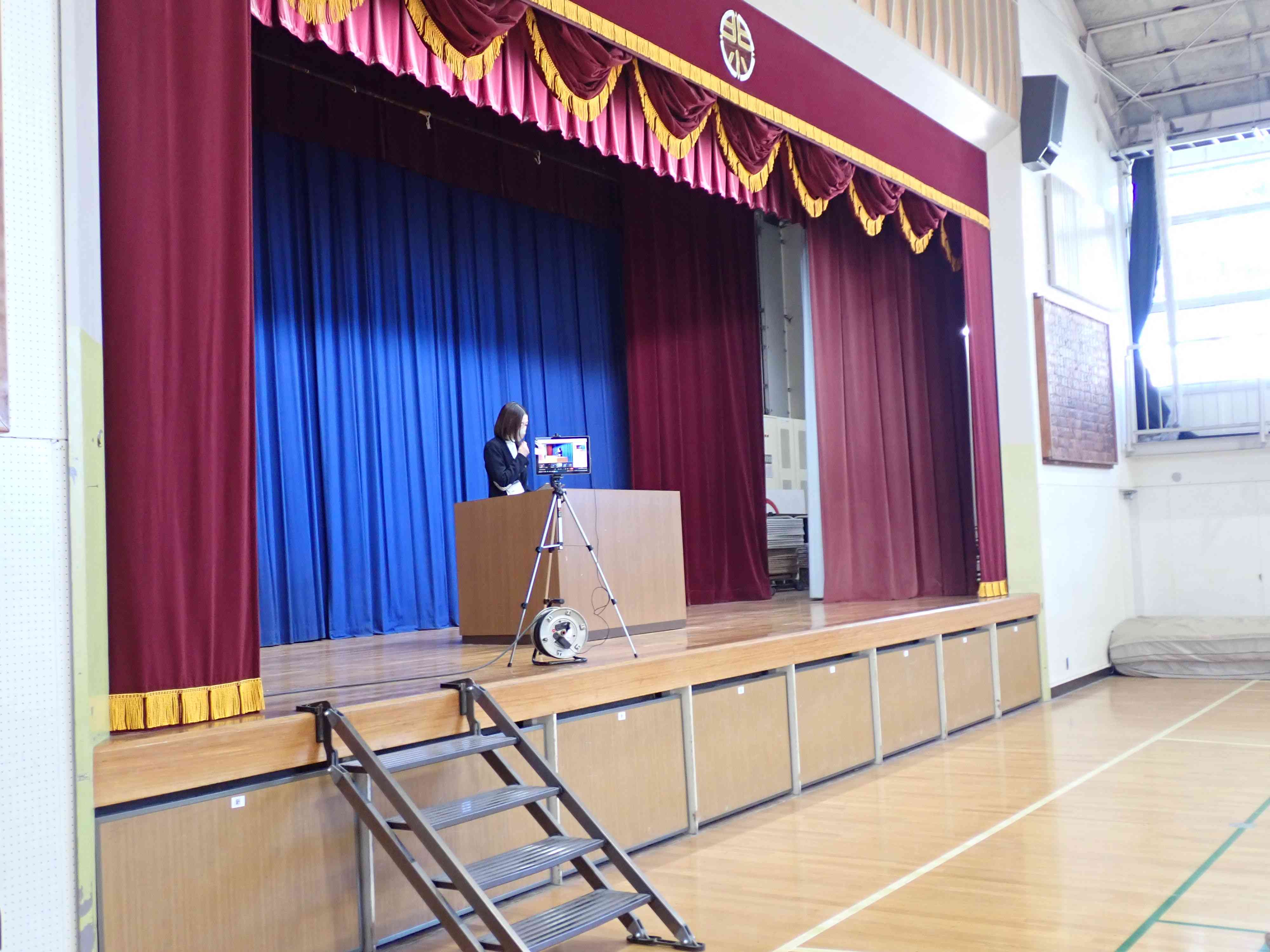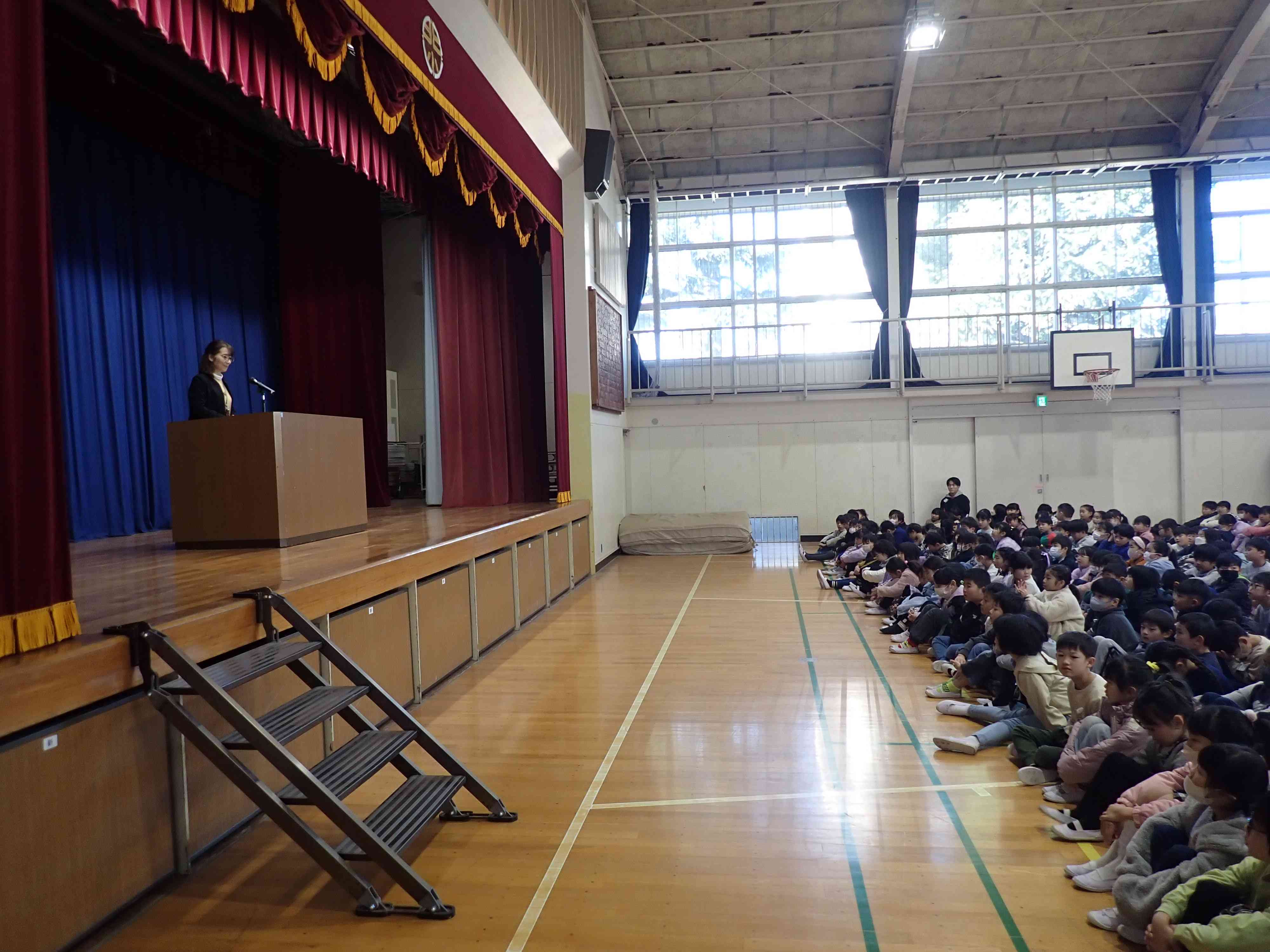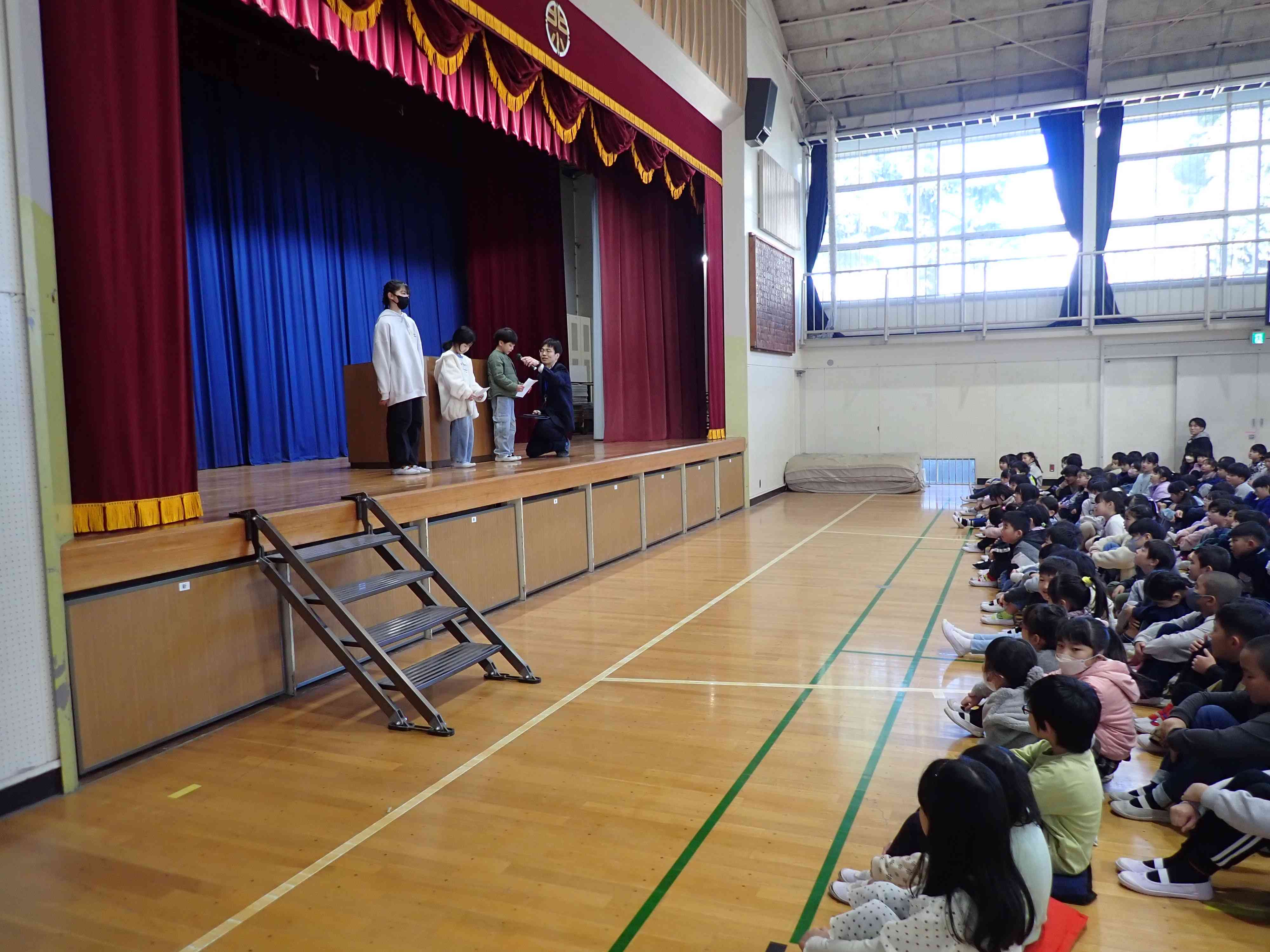 第3学期始業式を行いました。 児童数856名の為2・4・6年生が体育館で1・3・5年性は教室からのオンライン視聴での実施です。 2・4・6年生の代表児童が今年の目標を発表しました。 校長先生からは数字にまつわるお話がありました。 養護教諭から寒さに負けない体づくりについて子どもたちへお話をしました。