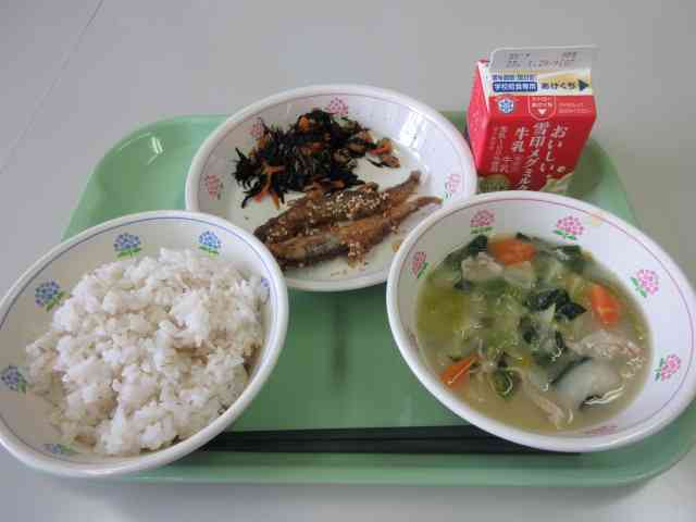 今日の献立は、麦ごはん、ししゃもの南蛮漬け、ひじきの炒り煮、ゆずみそ汁、牛乳です。 ゆず果汁、人参、ほうれん草、キャベツは相模原市内産、豚肉は神奈川県内産です。 ゆずみそ汁には、豚肉、人参、キャベツ、ほうれん草、かぶ、ゆず果汁が入っています。かぶは秋の終わりから冬にかけてたくさんとれる野菜で寒くなると甘みが増して美味しくなります。みんなの体を元気にしてくれるビタミンCがたくさん含まれています。 かぶは、体の調子を整えるみどりのなかまの食べ物です。【添付ファイル】