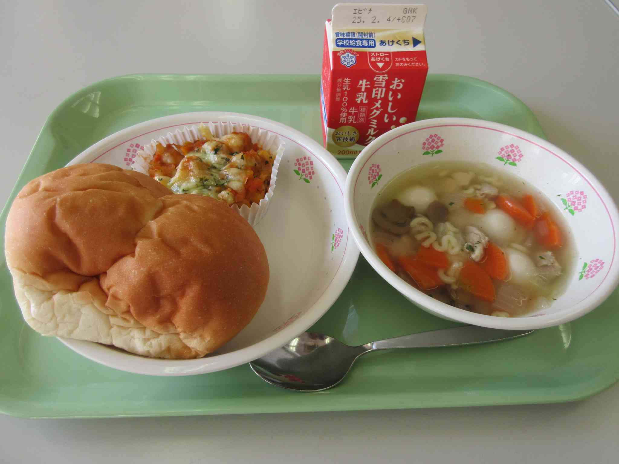 今日の献立は、ソフトフランスパン、ポテトミートグラタン、うずらの卵のスープ、牛乳です。 人参は相模原市内産、豚肉は神奈川県内産です。 ポテトミートグラタンには、じゃがいも、人参、玉ねぎ、豚ひき肉、パセリ、チーズ、そしてレンズ豆が入っています。レンズ豆は平べったくて黄色っぽい色でとても小さな豆ですが、食物繊維や鉄、マグネシウムなどの無機質もたくさん含まれています。 じゃがいもは、熱や力のもとになるきいろのなかまの食べ物です。【添付ファイル】