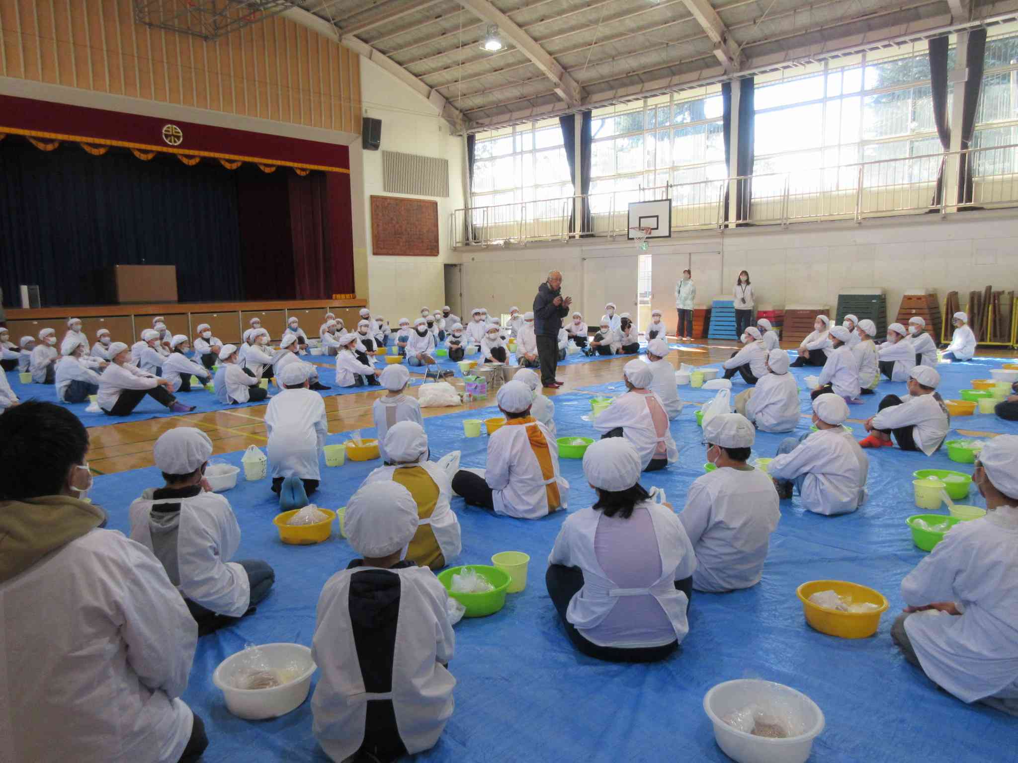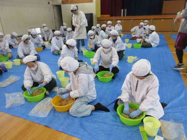 6年生は総合で津久井大豆を育ててきました。 その大豆で味噌づくりの体験をしました。 前日から大豆を水にさらしました。 大豆を柔らかくなるまで4時間ほどかけて煮るところは、 養鶏場を経営されている大豆・味噌づくりのプロの方々にやっていただきました。 保護者のボランティアさんが10名、豆や麹、塩などの小分けをしてくださいました。 午後からは子どもたちの出番です。 味噌の作り方の説明を聞き、大豆をつぶして、麹や塩などを入れ、 よくねっていきました。 みんな、真剣に楽しそうに体験していました。 さすが6年生、片付けまできっちり時間内に終わりました。 家庭に持ち帰った味噌については、 23日にプリントが出ますので、ご家庭で熟成させてください。【添付ファイル】