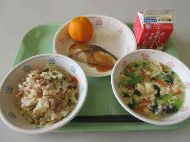今日は6年生が考えてくれた給食です。献立は、クアジューシー、ぶりのゆずみそ焼き、チンゲンサイスープ、ぽんかん、牛乳です。 卵と人参、ゆず果汁は、相模原市内産です。 クアジューシーは沖縄の料理で、肉や野菜が入った混ぜご飯です。細切り昆布とハムがたっぷり入っています。沖縄の珍しい和風料理に、冬が旬のぽんかんやゆず、ぶりを使った給食になりました。 ハムは、体をつくるもとになる赤のなかまの食べ物です。