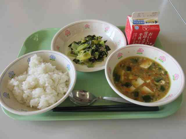 今日の献立は、ごはん、麻婆豆腐、キャベツとわかめのサラダ、牛乳です。 人参とキャベツは相模原市内産、豚肉は神奈川県内産です。 キャベツは英語でキャベッジといいます。日本語の呼び方と似ていますね。キャベツは実は暑さが苦手な野菜です。キャベツは南から北へ、平地から高原へと日本の大地の中で産地リレーしているので、春キャベツから冬キャベツまで1年中食べることができます。 キャベツは、体の調子を整えるみどりのなかまの食べ物です。【添付ファイル】