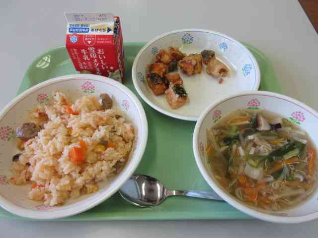 今日の献立は、メキシカンライス、さけのからあげ、 もやしスープ、牛乳です。 メキシカンライスには29kg、約200個のトマトを使いました。 「トマトが赤くなると医者が青くなる」という ことわざがあるほどトマトにはビタミンAやビタミンC、 リコピンなど、病気になりにくい栄養が たくさん含まれています。 トマトは体の調子を整えるみどりのなかまの食べ物です。