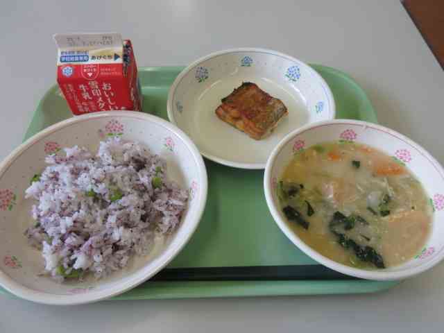 今日の献立は、枝豆ゆかりごはん、 たちうおのカレー焼き、ごまみそ汁、牛乳です。 ごまみそ汁に入っているキャベツと小松菜は相模原市内産です。 枝豆は大豆がまだ未熟なうちに収穫した夏野菜です。 枝豆は大豆と同じように体をつくるたんぱく質や カルシウム、鉄などの栄養が含まれていますが、 大豆にはほとんどないビタミンCやカロテンも含まれています。 ごまみそ汁には大豆も入っています。 枝豆は、体の調子を整えるみどりのなかまの食べ物です。【添付ファイル】