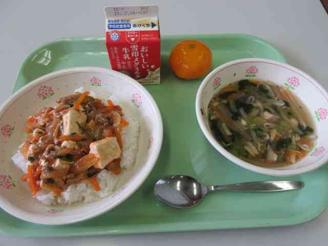 今日の献立は、四川豆腐丼、五目スープ、 冷凍みかん、牛乳です。 玉ねぎと小松菜は相模原市内産です。 四川豆腐丼にはトウバンジャンという 辛い調味料を使っています。 トウバンジャンは空豆から作られたもので、 豚肉と玉ねぎ、にんにく、しょうがと炒めて、 たっぷりの豆腐と一緒に味付けして四川豆腐丼にしました。 ごはんと一緒にもりもり食べて 暑さに負けない体をつくりましょう。 豆腐は体をつくる赤のなかまの食べ物です。