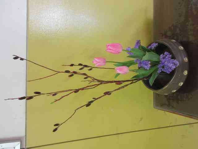2月13日のお花は、 黒柳、チューリップ、サターチスです。 初め赤く見える黒柳はだんだんと黒くなってくるそうです。