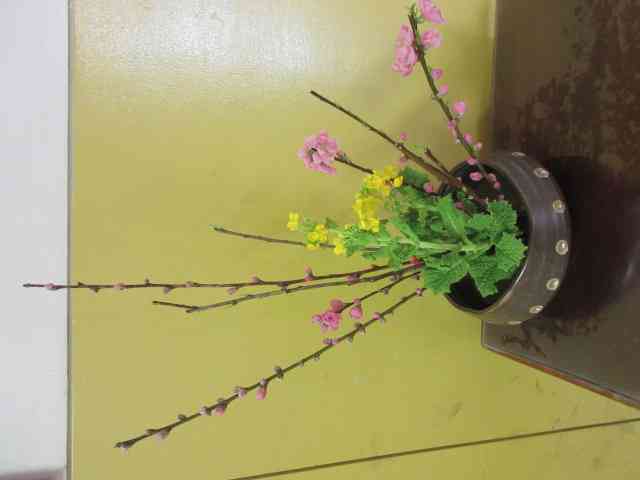 2月27日のお花は、 桃と菜の花です。 3月3日はひなまつりですね。 桃の節句に合わせたお花を生けてくださいました。