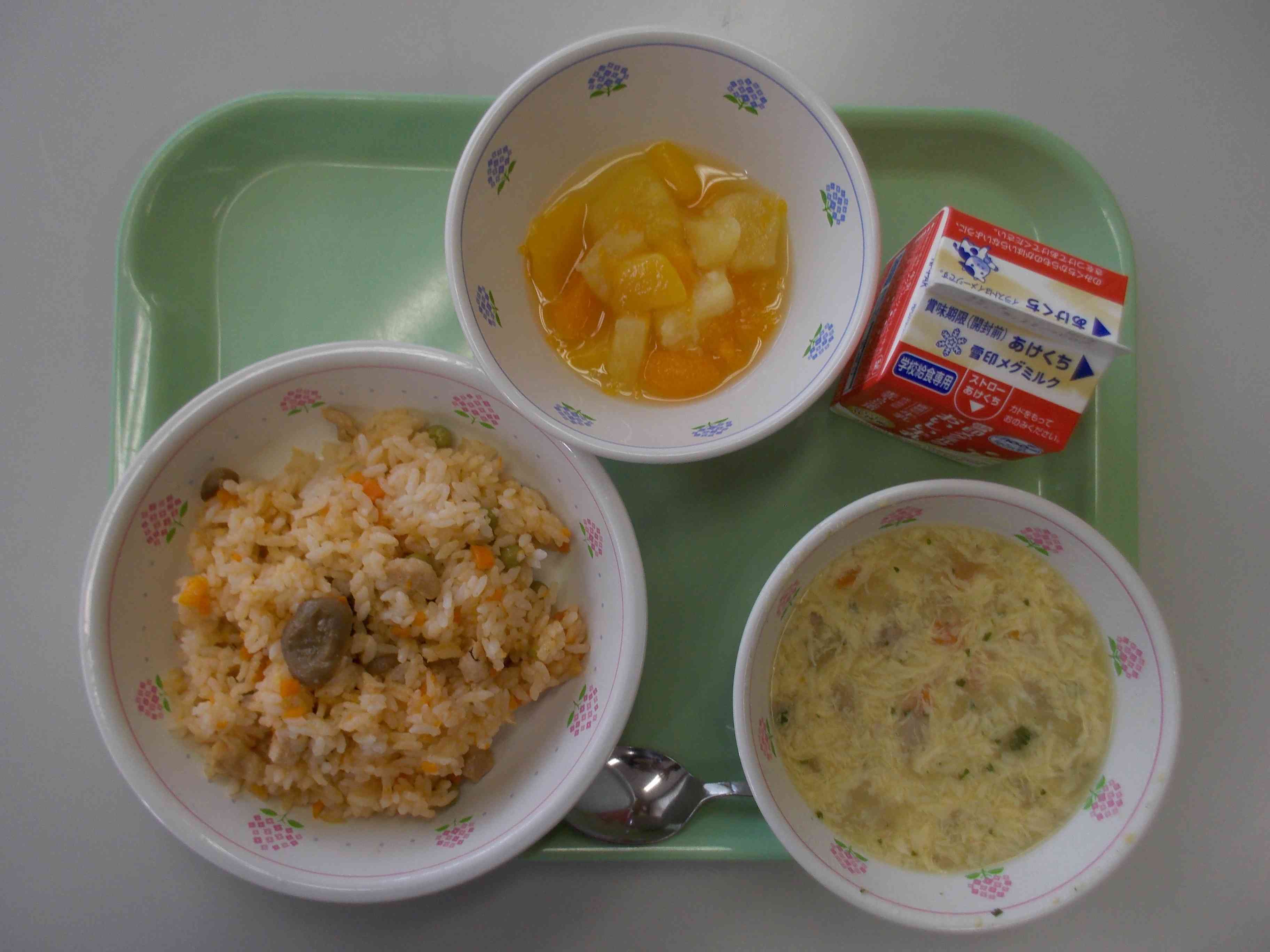 今日の献立は、チキンライス、洋風かきたま汁、フルーツあえ、牛乳です。 卵は相模原市内産です。 給食にはいろいろな食物が使われています。食べ物の名前や味をたしかめながら食べてみましょう。洋風かきたま汁には、卵とベーコン、じゃがいも、にんじん、玉ねぎ、パセリが入っていて、鶏ガラで取ったスープを使って作りました。 鶏肉は、体をつくるもとになる赤のなかまの食べ物です。