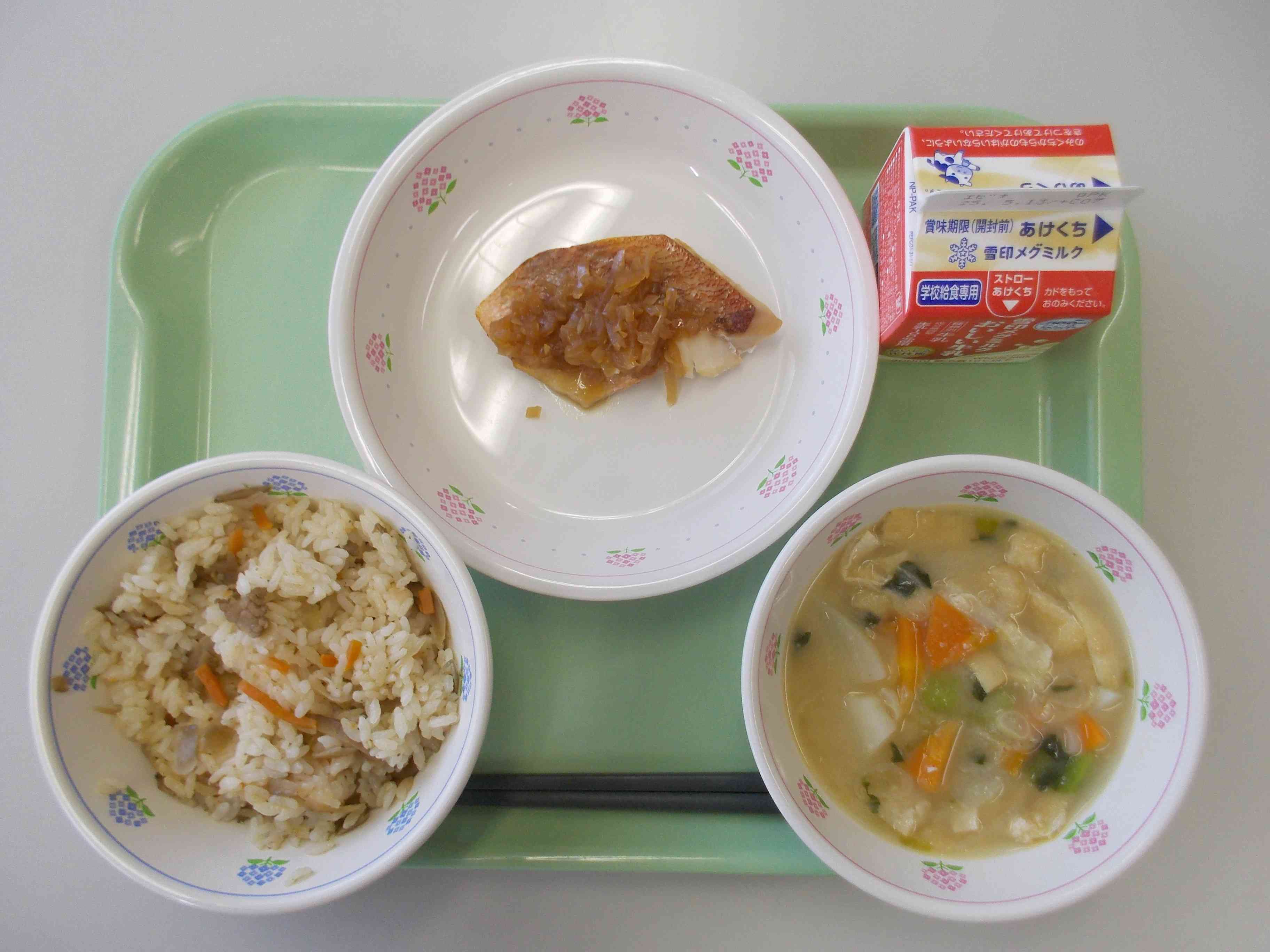 今日の献立は、きんぴらごはん、赤魚の和風ソース、ごまみそ汁、牛乳です。 食べ物には、体の中に入るとそれぞれ働きがあって、それを大きく3つの色のなかまに分けています。熱や力のもとになるきいろのなかまの食べ物、体をつくるもとになる赤のなかまの食べ物、体の調子を整えるみどりのなかまの食べ物です。給食には3つの色のなかまの食べ物が必ず入っています。 ごぼうは、体の調子を整えるみどりのなかまの食べ物です。