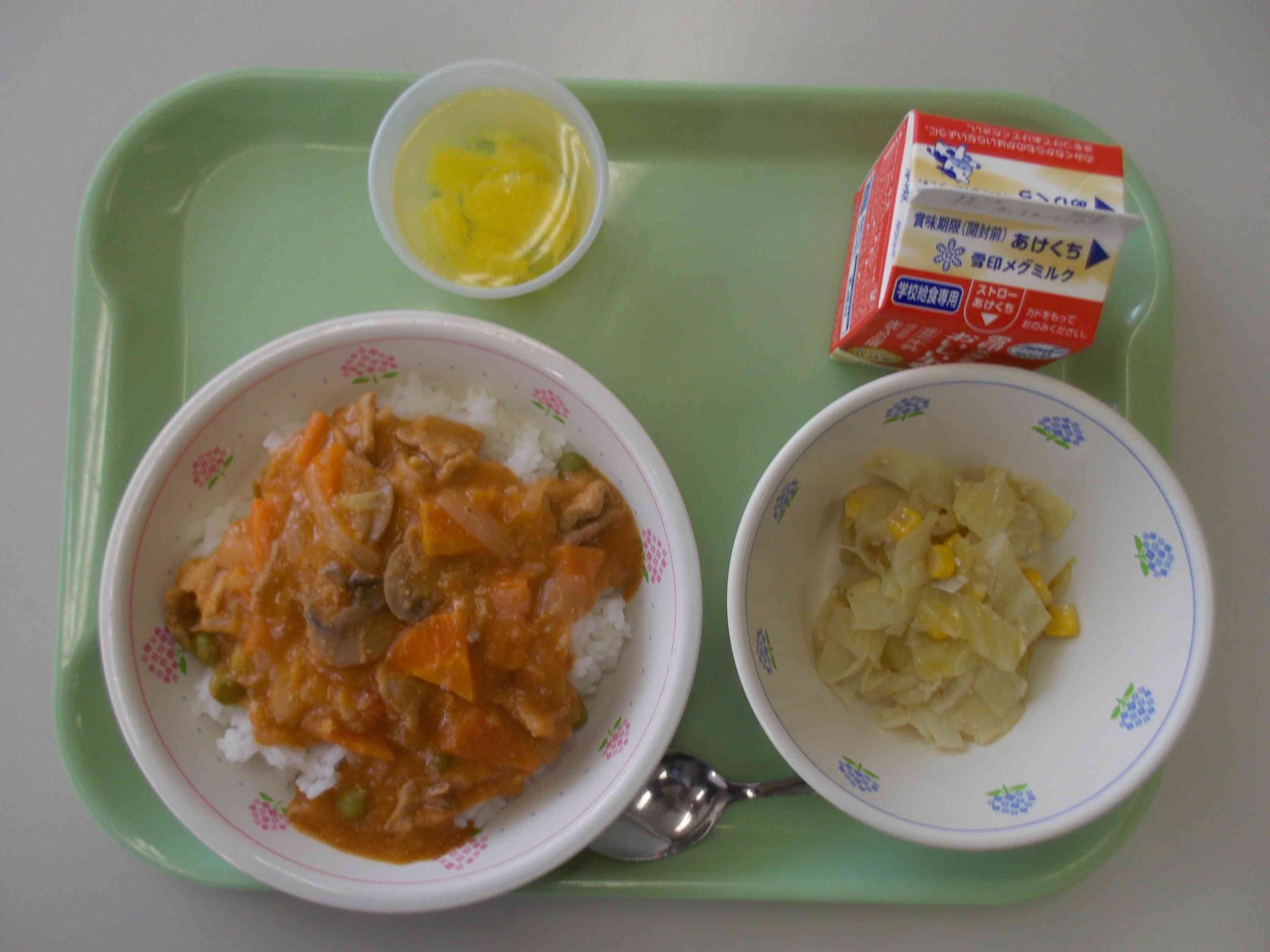今日の献立は、ハヤシライス、キャベツのごまサラダ、甘夏みかんゼリー、牛乳です。 ハヤシライスは、赤ワインにつけこんだ豚肉を玉ねぎとトマトなどで煮込んで作りました。ハヤシライスは日本生まれの料理です。 甘夏みかんゼリーは給食室の手作りです。 豚肉は、体をつくるもとになる赤のなかまの食べ物です。