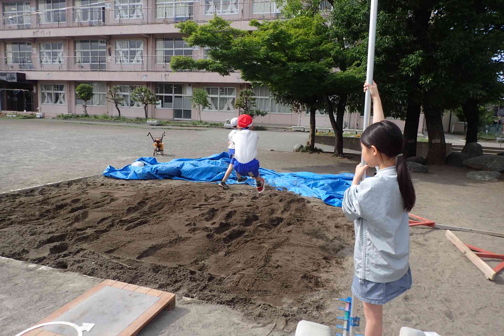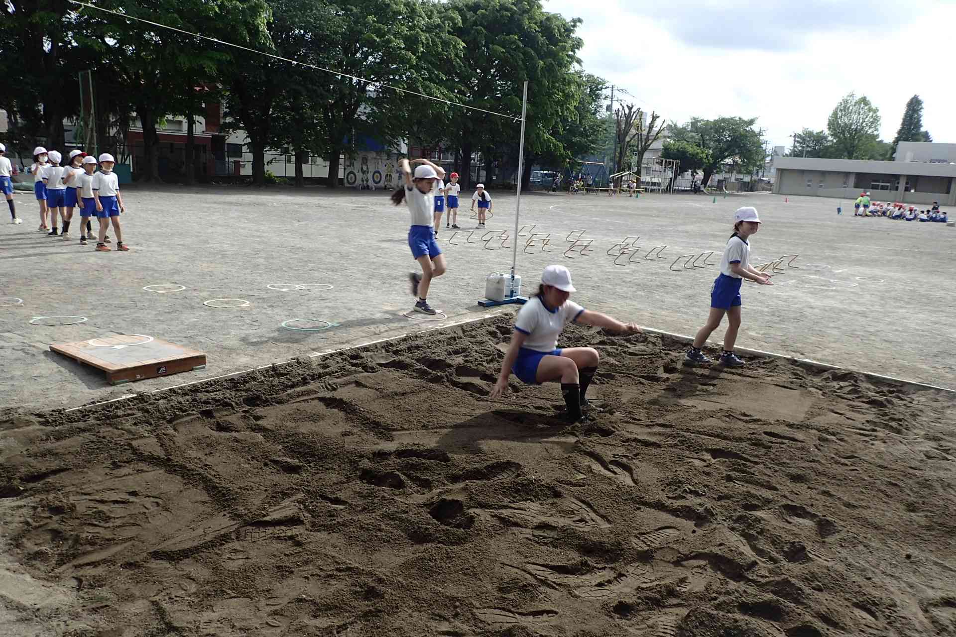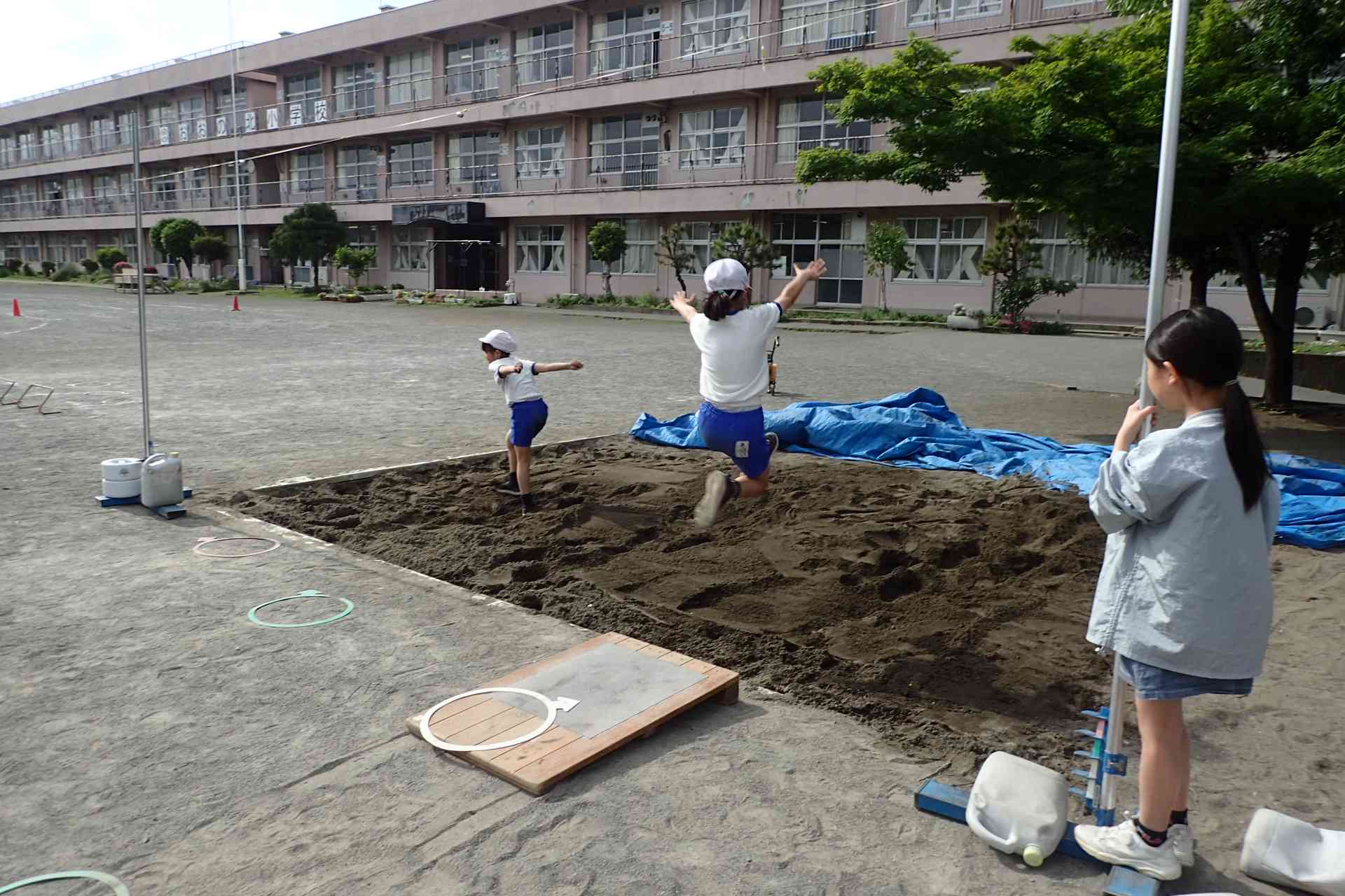 体育で走り幅跳びを行っています。 「助走は何歩がいいかな?」「踏切足はどちらがいいかな?」 「空中姿勢のフォームは?くの字に近づけている?」 「着地はうまくできているか」 さらに記録を伸ばすために,何度も跳んで試行錯誤したり,友達からアドバイスをもらったりするなど意欲的に活動する姿が見られました。