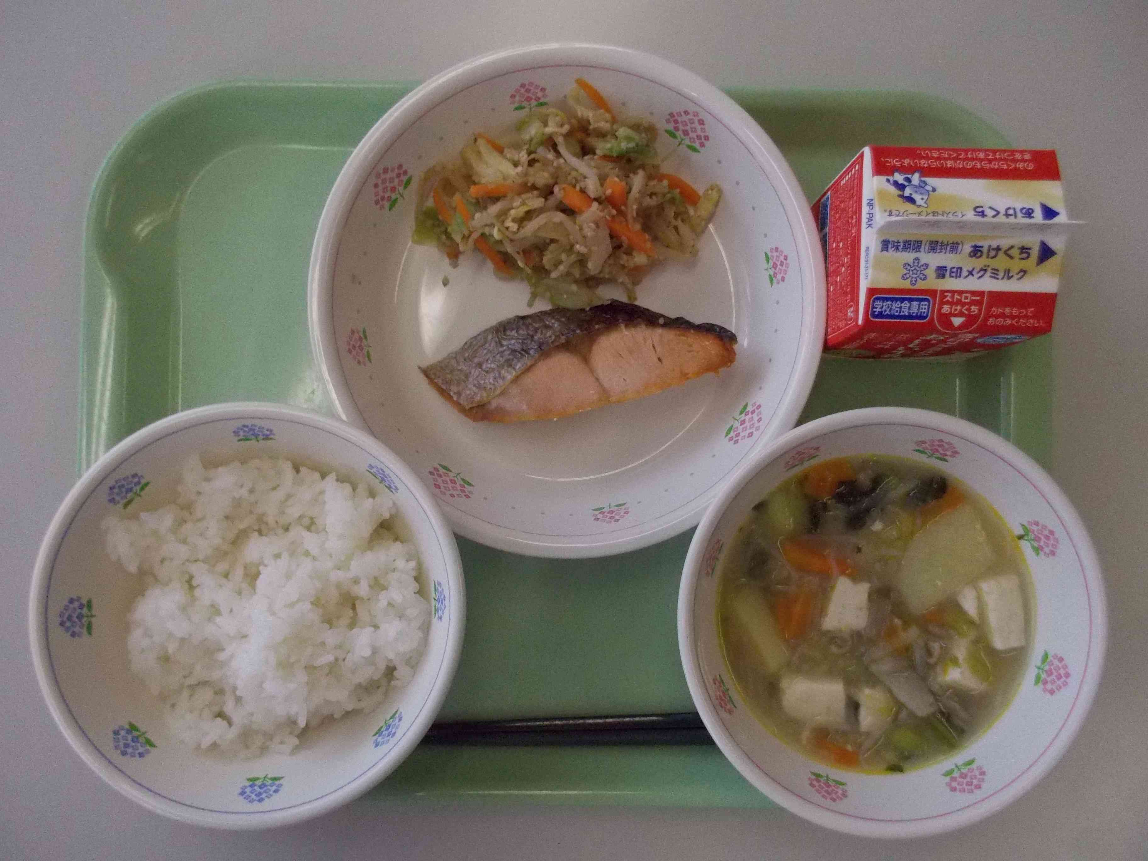 今日の献立は、ごはん、鮭の塩焼き、野菜のごまあえ、豚汁、牛乳です。小松菜は神奈川県内産です。 給食には、毎日たくさんの野菜が入っています。給食は必ず火を通しているので生よりもたくさんの量の野菜を食べることができます。野菜には、ビタミンや食物繊維がたくさん含まれていて、みんなの体を元気にしてくれる働きがあります。 キャベツは、体の調子を整えるみどりのなかまの食べ物です。
