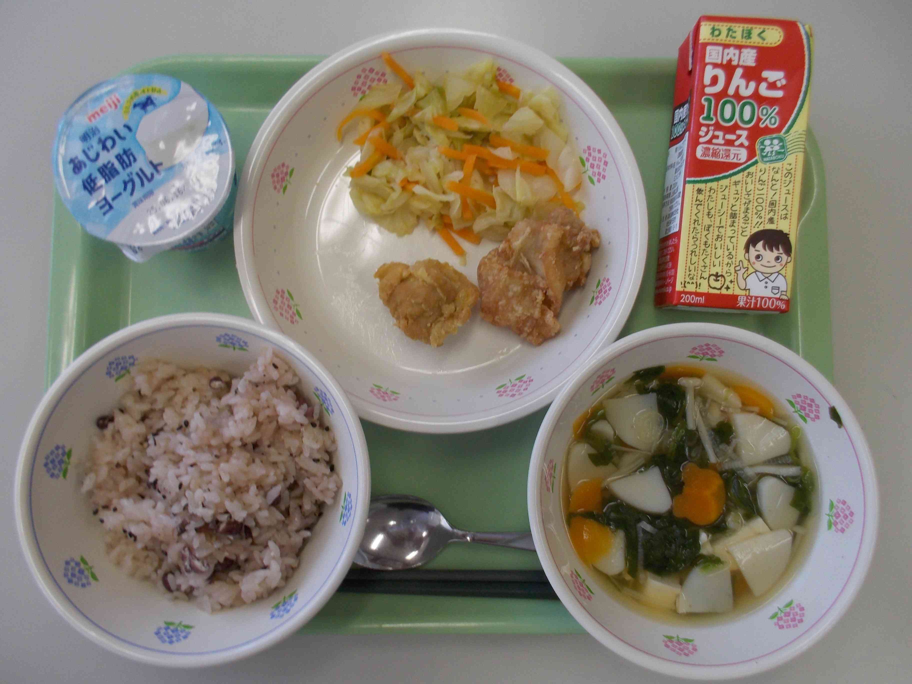 今日の献立は、赤飯、鶏の唐揚げ、キャベツの甘酢あえ、お祝い汁、りんごジュース、ヨーグルトです。 キャベツは大野北小で取れたものも使いました。 今日は開校記念日です。学校のお誕生日をお祝いして、お赤飯とラッキー人参が入ったお祝い汁、そしてみんなが大好きな鶏の唐揚げです。鶏の唐揚げは、塩ガーリック味とカレー味の2種類です。 鶏肉は、体をつくるもとになる赤のなかまの食べ物です。