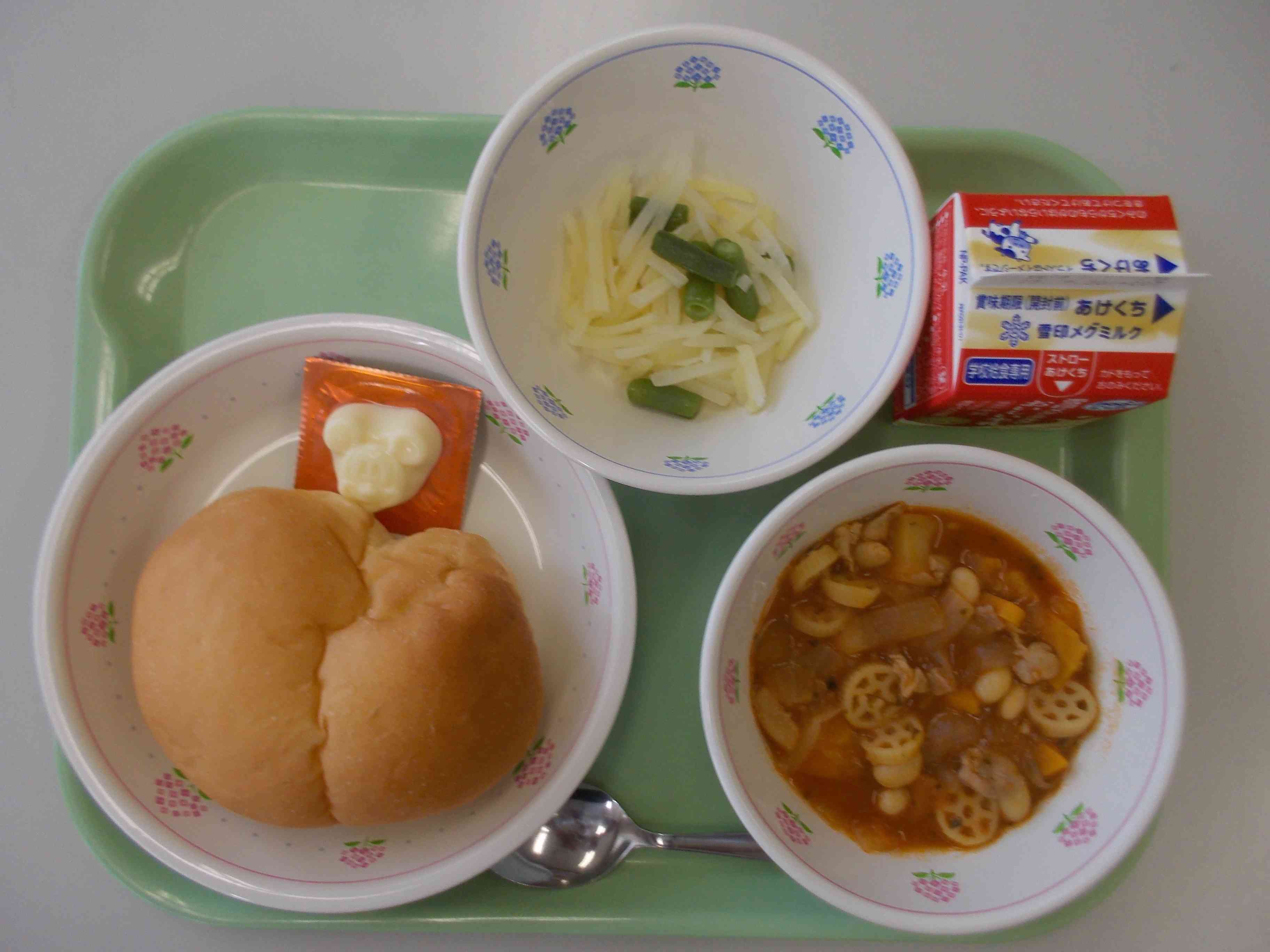 今日の献立は、ソフトフランスパン、大豆と鶏肉のトマト煮、じゃがいもとさやいんげんのソテー、型抜きチーズ、牛乳です。 さやいんげんは、いんげんができる前の若いさやごと食べられる野菜です。春から夏にたくさん取れます。1年に3回収穫できることから関西では三度豆とも呼ばれるそうです。さやいんげんにはビタミンB1、食物繊維がたくさん含まれています。 さやいんげんは、体の調子を整えるみどりのなかまの食べ物です。