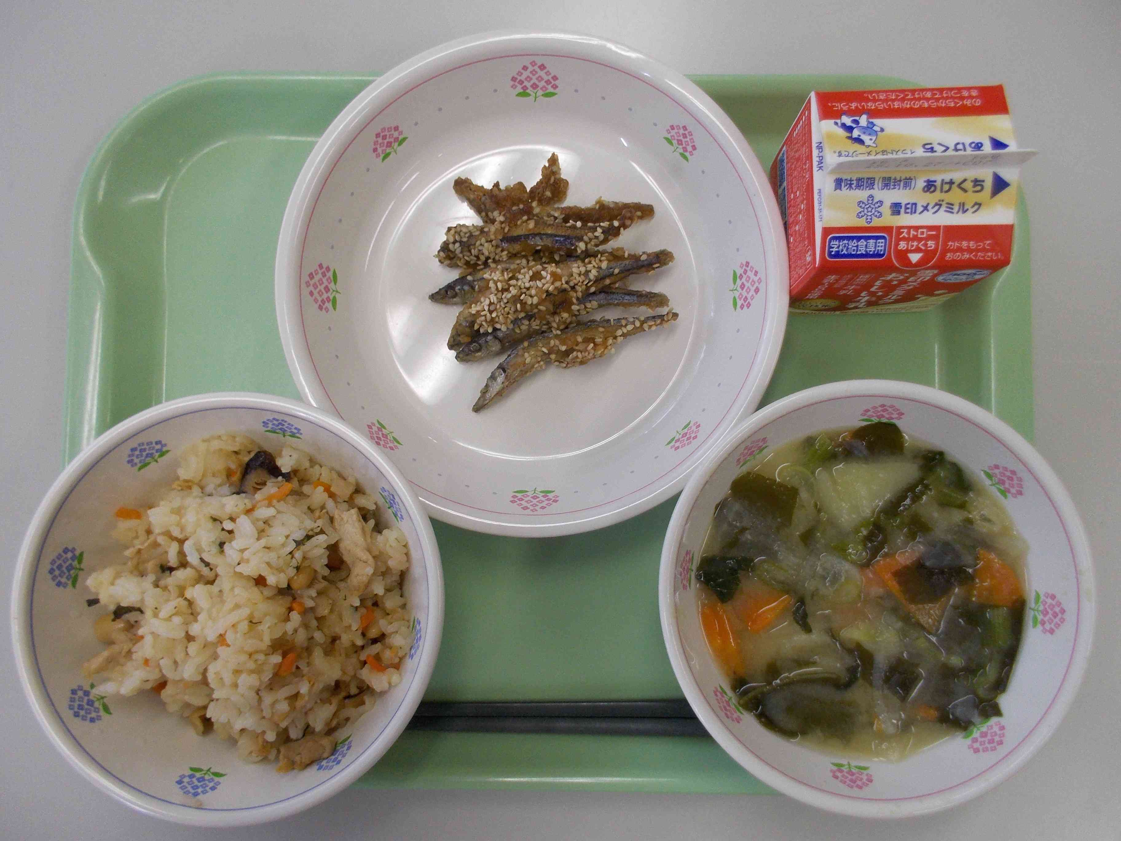 今日の献立は、かやくごはん、きびなごの南蛮漬け、みそ汁、牛乳です。 かやくごはんの「かやく」とは、白いごはんをさらにおいしくするために加える薬味や具材のことを指します。今日のかやくごはんは米・麦の他に、大豆、にんじん、凍り豆腐、油揚げ、しいたけ、小松菜が入っていて、だし汁と一緒に炊き込んで作りました。 凍り豆腐は、体をつくるもとになる赤のなかまの食べ物です。