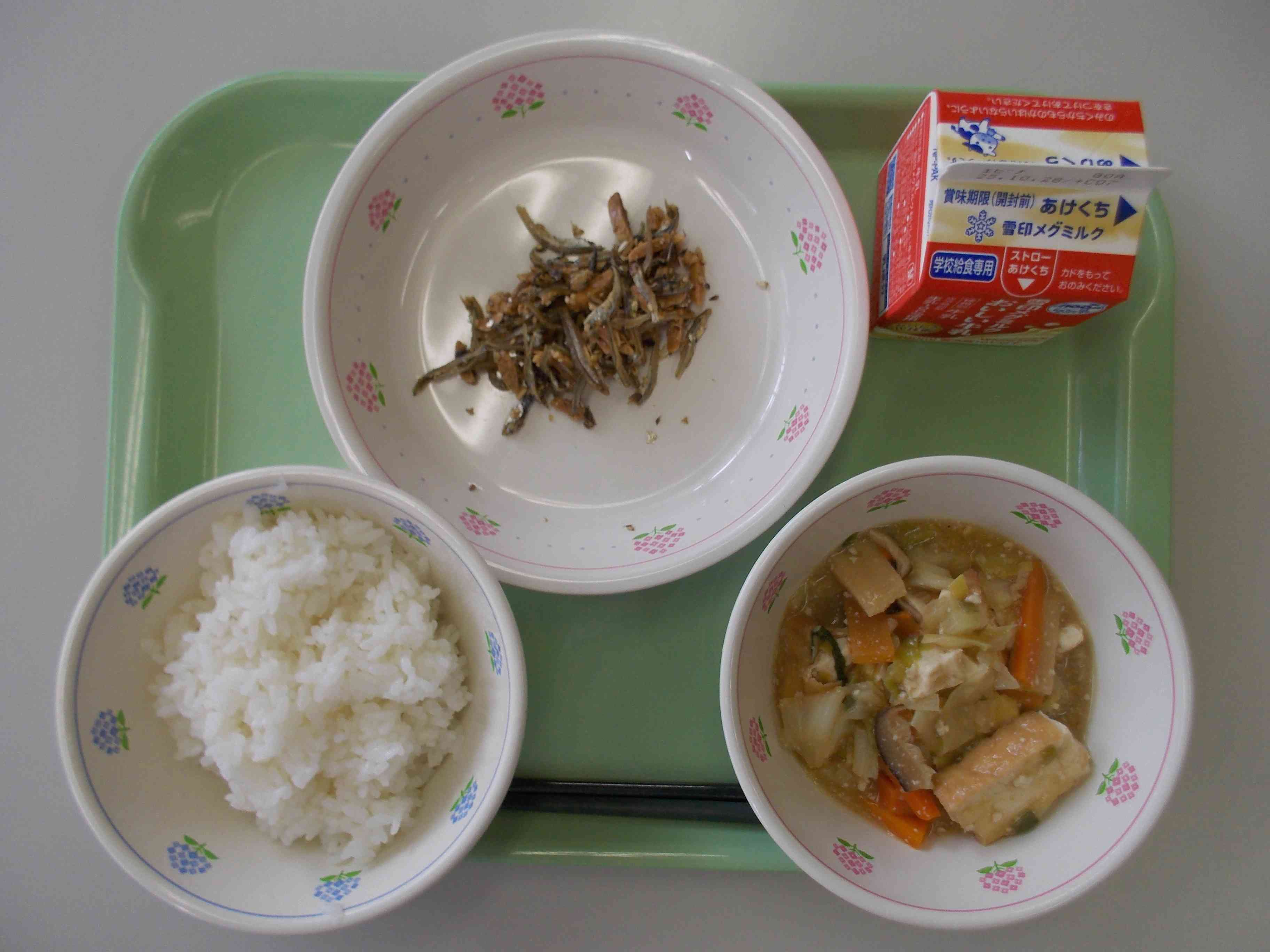 今日の献立は、ごはん、家常豆腐、いりことアーモンドのあまからあえ、牛乳です。 今日はのぞみ級の畑で取れたピーマンを家常豆腐に使いました。ありがとうございます! 涼しくなってスポーツの秋、食欲の秋にぴったりな季節になりました。しっかり食べて、よく動いて、夜は早く寝て、元気な秋にしましょう。 しいたけは、体の調子を整えるみどりのなかまの食べ物です。
