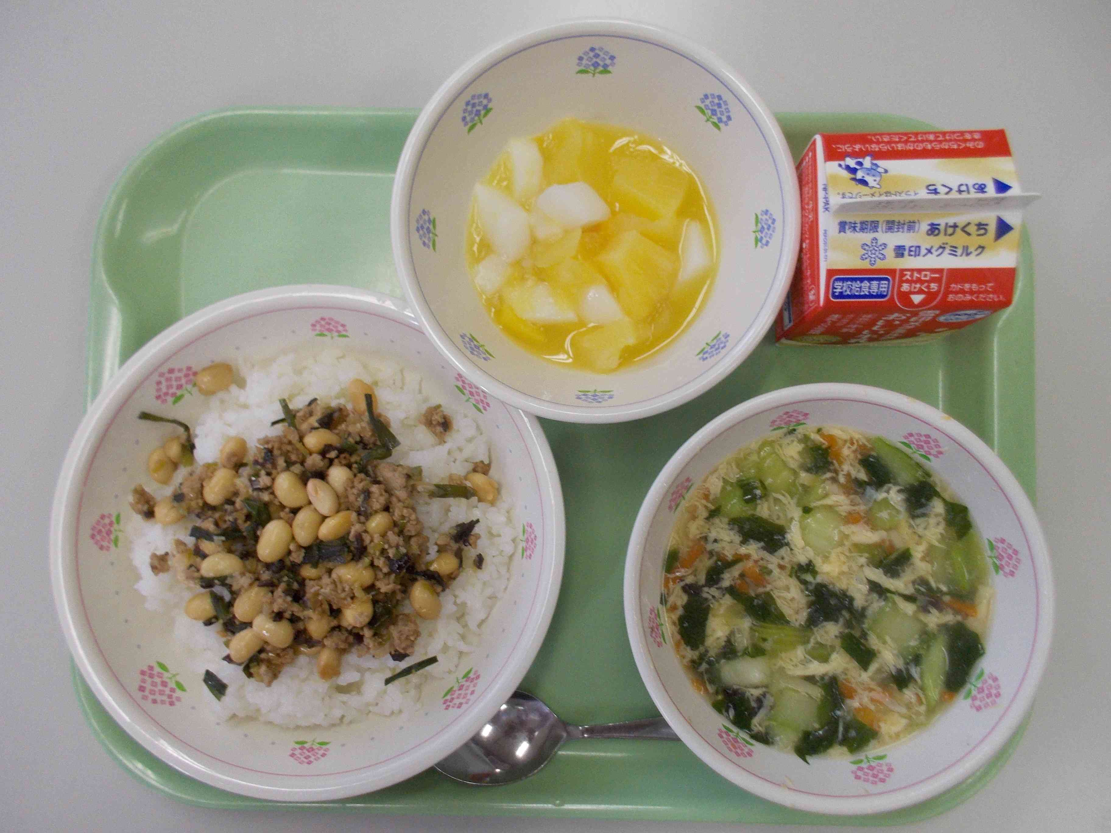 今日の献立は、麻婆大豆丼、チンゲンサイスープ、杏仁豆腐、牛乳です。卵は相模原市内産です。 麻婆大豆丼には北海道産の大豆を使っています。大豆は畑の肉といわれるほどたんぱく質などの栄養素がたくさん含まれています。大豆を使った料理もいろいろありますが、大豆から作られたみそやしょうゆ、豆腐、納豆など大豆加工品もたくさんあります。 大豆は体をつくるもとになる赤のなかまの食べ物です。