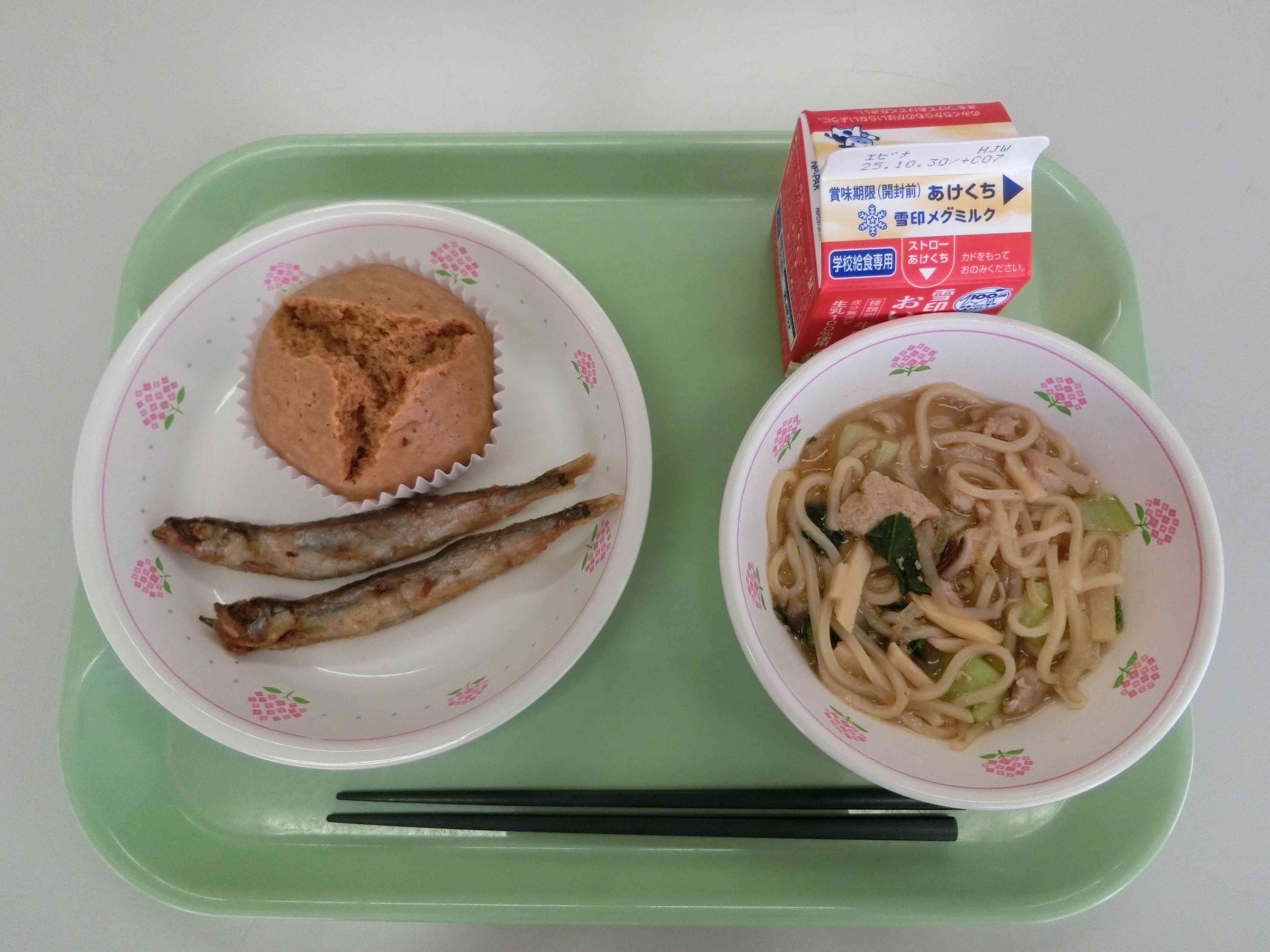今日の献立は、担々麺、ししゃもの唐揚げ、黒糖蒸しパン、牛乳です。卵は相模原市内産です。 担々麺は中国四川省の料理です。豚ひき肉に、もやしやたけのこ、長ねぎ、にんじん、しいたけ、青梗菜などのたっぷり野菜と赤みそ、豆板醤、ごまも合わせて担々麺にしました。 中華麺は、熱や力のもとになるきいろのなかまの食べ物です。