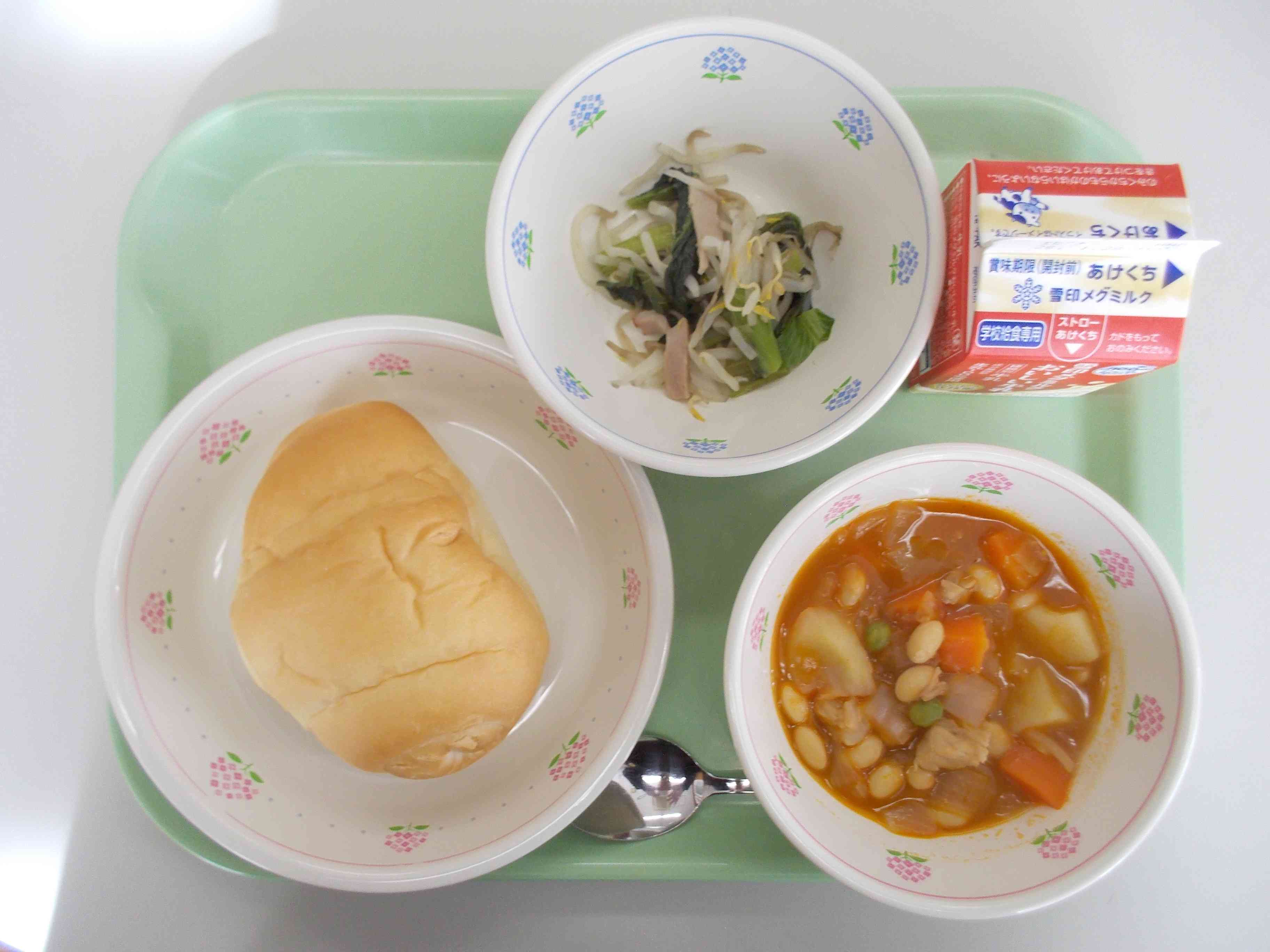 今日の献立は、ロールパン、ポークビーンズ、小松菜ともやしのソテー、牛乳です。じゃがいもは相模原市内産、小松菜は神奈川県内産です。 ポークビーンズはアメリカで生まれた家庭料理です。北海道産の大豆を使って、豚肉と人参、玉ねぎなどの野菜とじっくり煮込んで作りました。 大豆は、からだをつくるもとになる赤のなかまの食べ物です。