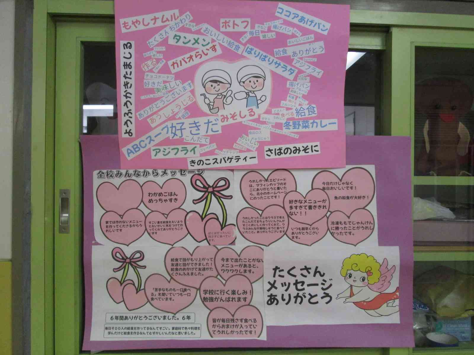 1月30日まで給食週間でした。 給食委員会が給食についての掲示をしたり、クイズを放送してクイズラリーをしたりしました。 給食週間のアンケートで、調理員さんへのメッセージをたくさんもらいました。とてもうれしかったです。ありがとうございます。 学級閉鎖などでお休みした人も、クラスルームにあるアンケートはいつでも回答できるので、まだの人はぜひ入力してください。