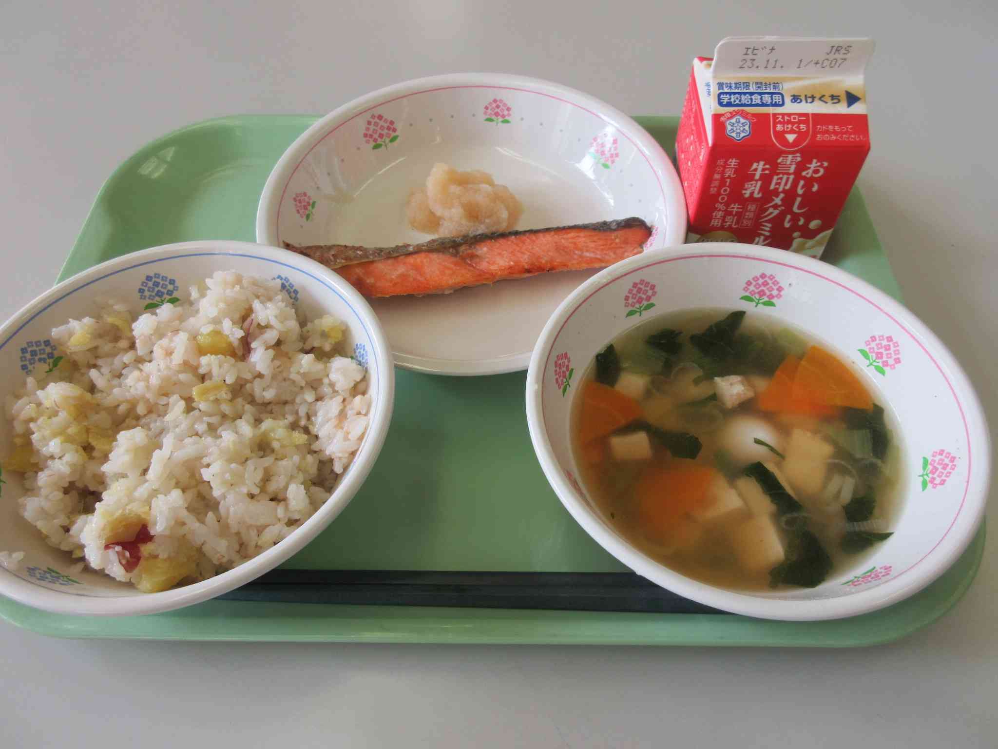 今日のこんだては、さつまいもごはん、鮭の塩焼き、大根おろし、すまし汁、牛乳です。 すまし汁に入っている小松菜は相模原市内産です。 今日は食育の日です。 さつまいもは秋にたくさんとれる野菜です。さつまいもは熱や力のもとになるでんぷんの他に、ビタミンCやおなかの調子をよくする食物せんいもたくさん含まれています。今日は2年生が大野北小の畑に植えて掘ってくれたさつまいもも給食に使いました。 さつまいもは熱や力のもとになるきいろのなかまの食べ物です。【添付ファイル】