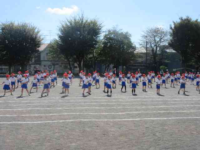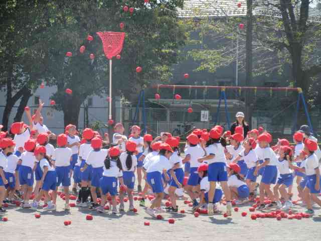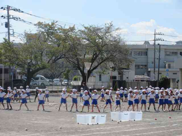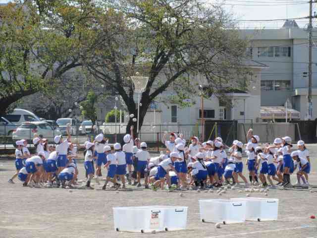 1年生の運動会玉入れは、 おどったり、玉を投げたり、 楽しく、一生懸命に練習しています。