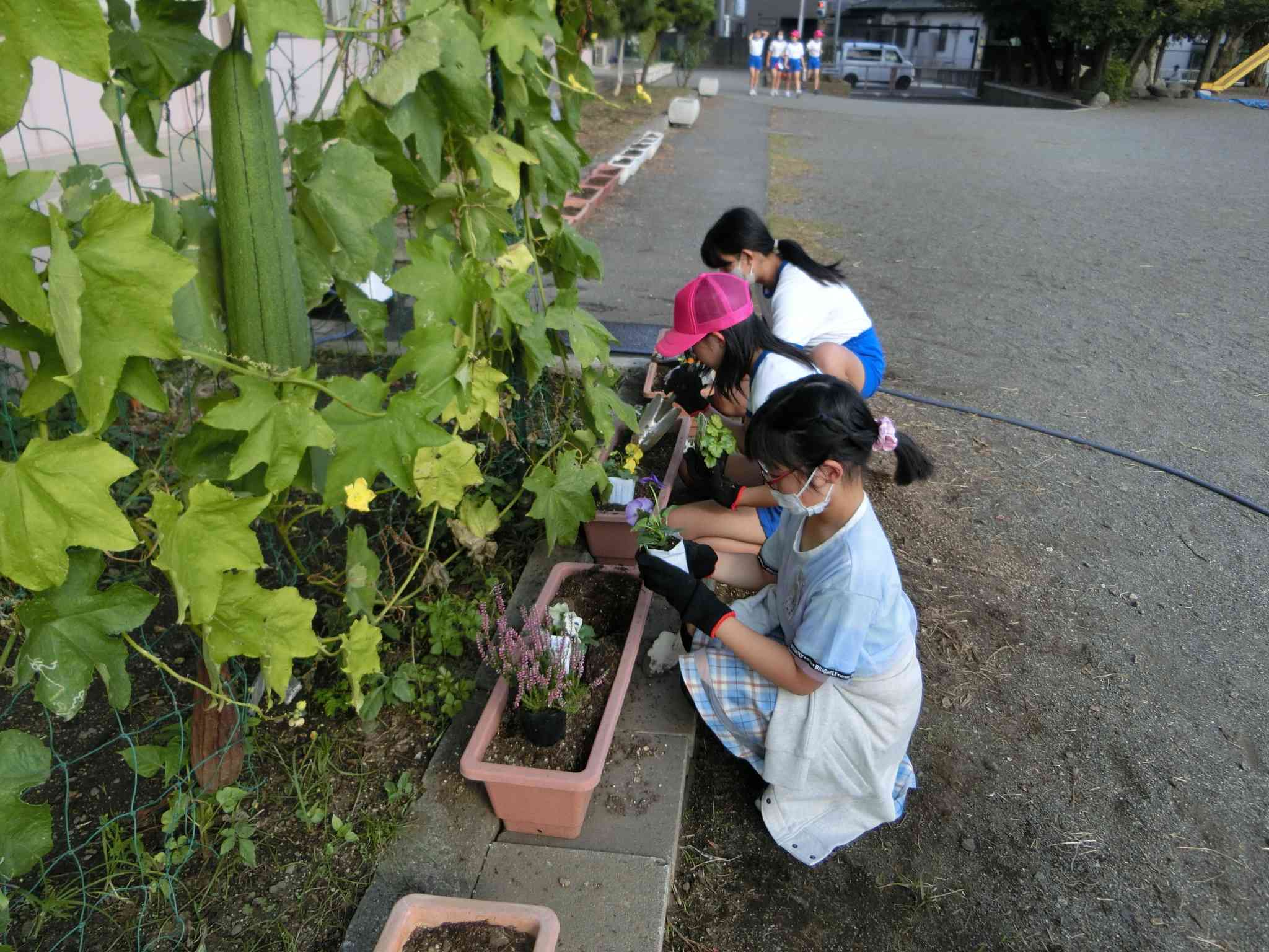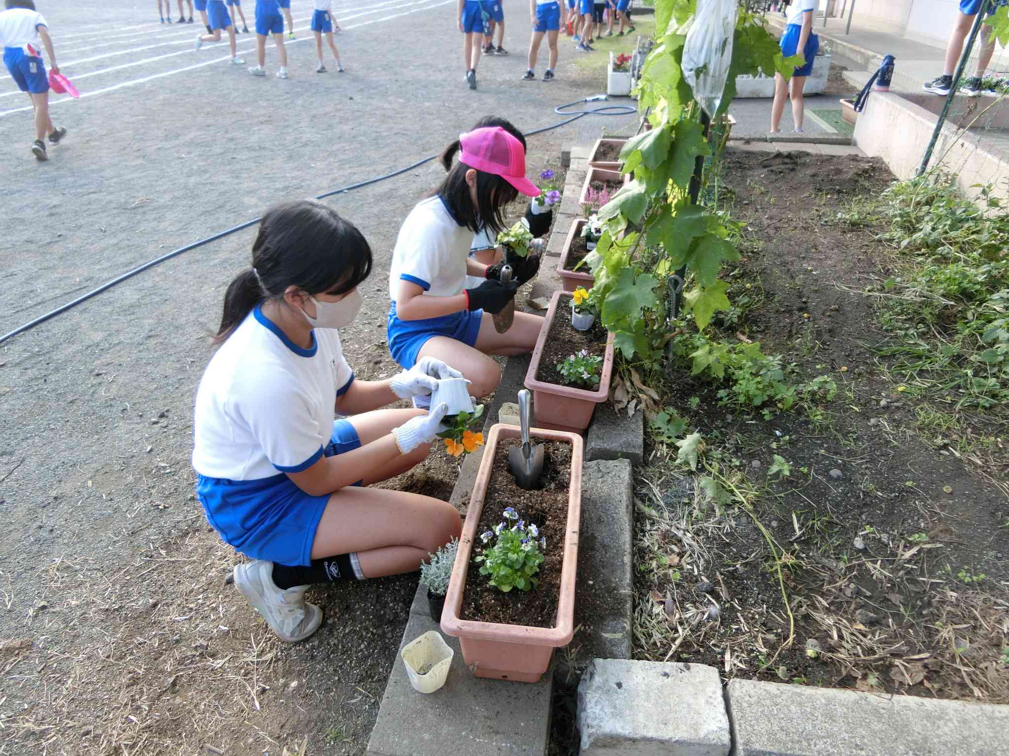 生きもの委員会の花の栽培を担当している5・6年生とプランターに花苗を植えました。 運動会に向けて環境を整備しています。