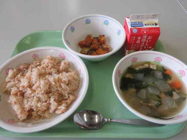 今日のこんだては、アーモンドそぼろごはん、鮭のカレー揚げ、ひよこ豆のスープ、牛乳です。 ひよこ豆のスープに入っている小松菜は相模原市内産です。 今日のお米は、神奈川県で今年収穫された「はるみ」という品種のお米で新米です。新米とはその年に取れたお米のことをいいます。つやつやの甘くておいしい新米の炊きたてごはんに、給食室で作ったそぼろを合わせました。そぼろは、鶏ひき肉をしょうがといっしょに炒めて味付けしてアーモンドと入っています。 お米は熱や力のもとになるきいろのなかまの食べ物です。【添付ファイル】