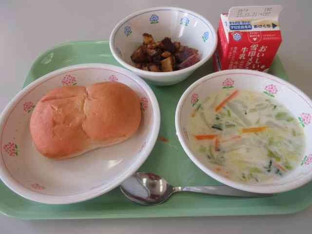 今日のこんだては、ソフトフランスパン、大豆とさつまいものかりんとう、白菜のクリームスープ、牛乳です。 今日は11月8日、いい歯の日です。健康ないい歯を保つことで、おいしく楽しく食べることができるし、体も頭もずっと健康でいられるといわれています。よくかんで食べるとむし歯予防になったり、食べすぎを防いだり、よいことがたくさんあります。大豆とさつまいものかりんとうは少し硬いですがよくかんで食べてください。 黒ざとうは、熱や力のもとになるきいろのなかまの食べ物です。【添付ファイル】