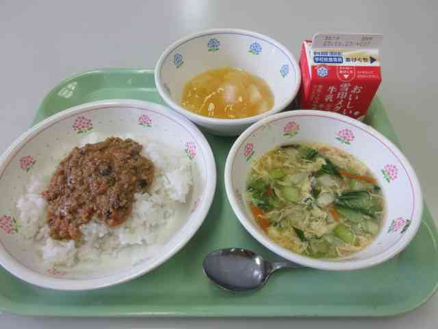 今日のこんだては、ごはん、ドライカレー、チンゲンサイスープ、フルーツジュレ、牛乳です。 ドライカレーは、日本で生まれたカレー料理です。ドライカレーは、ひき肉と小さく切った野菜を炒めて作ります。ルウやスープを入れるカレーと違って汁気・水分が少ない、ドライという意味からドライカレーといわれます。ごはんと一緒にもりもりよくかんで食べてください。 ピーマンは体の調子を整えるみどりのなかまの食べ物です。