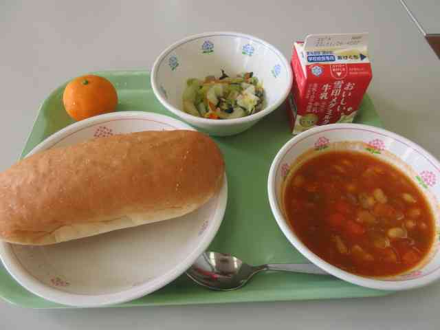 今日のこんだては、コッペパン、ポークビーンズ、白菜のソテー、みかん、牛乳です。 今週は給食週間です。ポークビーンズには大豆、白菜のソテーにはエリンギというきのこが入っています。豆やきのこにはおなかの調子をよくしてくれる食物繊維がたくさん含まれています。苦手な人もぜひ一口食べてみましょう。 エリンギは、体の調子を整えるみどりのなかまの食べ物です。